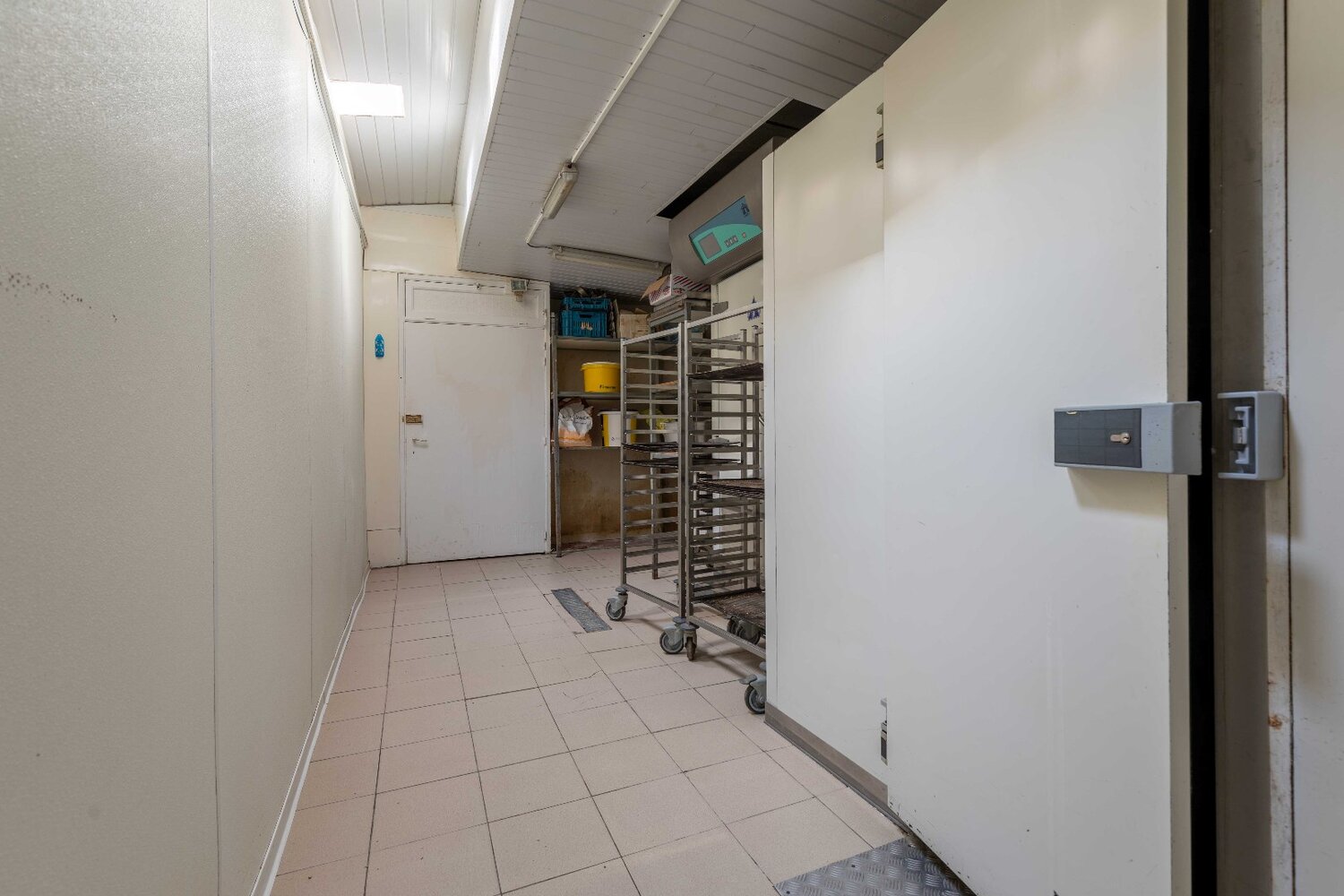 Op de hoek bevindt zich een winkel, met daarachter het bureel met keuken en - over de hele breedte van de 3 percelen uitgesponnen - een zeer goed geëquipeerde en zeer praktische en ruime bakkerij +/- 200 m²), met warme kant, koude kant, grote koel- en diepvriescellen, stockage en 2 grote poorten om te leveren.
