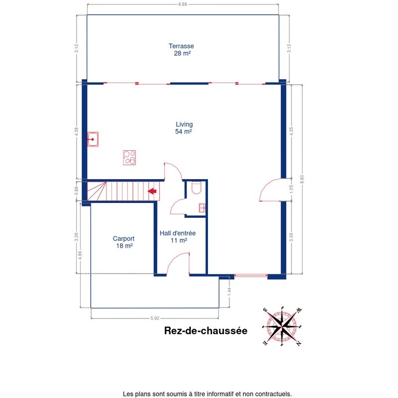 De begane grond bestaat uit een gezellige inkomhal, een apart toilet, een ruime, lichte woonkamer met salon en eetkamer, en een volledig uitgeruste keuken met hoogwaardige apparatuur en een hoogwaardige afwerking.