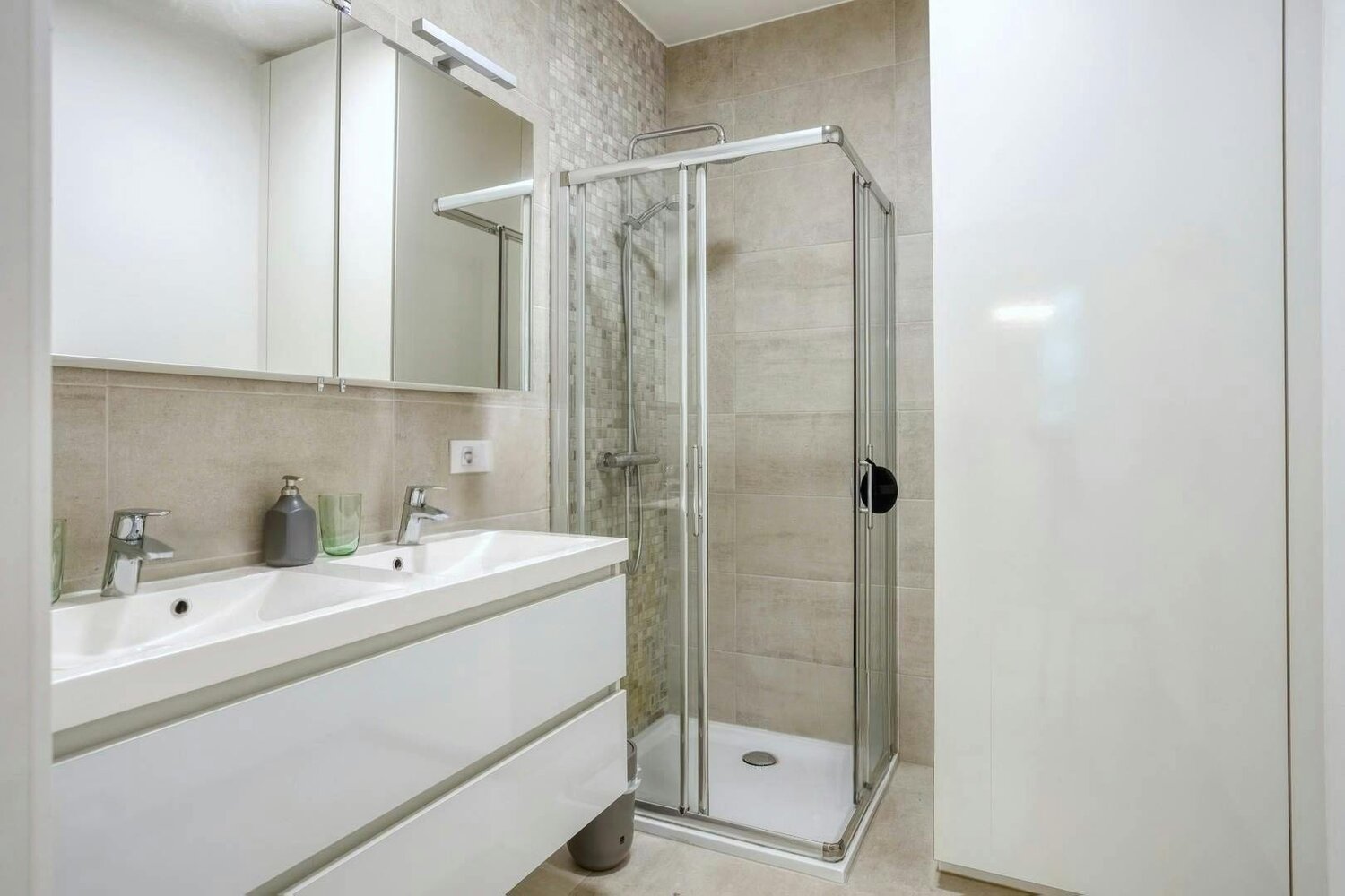 - badkamer met douche, dubbele lavabo en ingemaakte kast voor wasmachine en droogkast