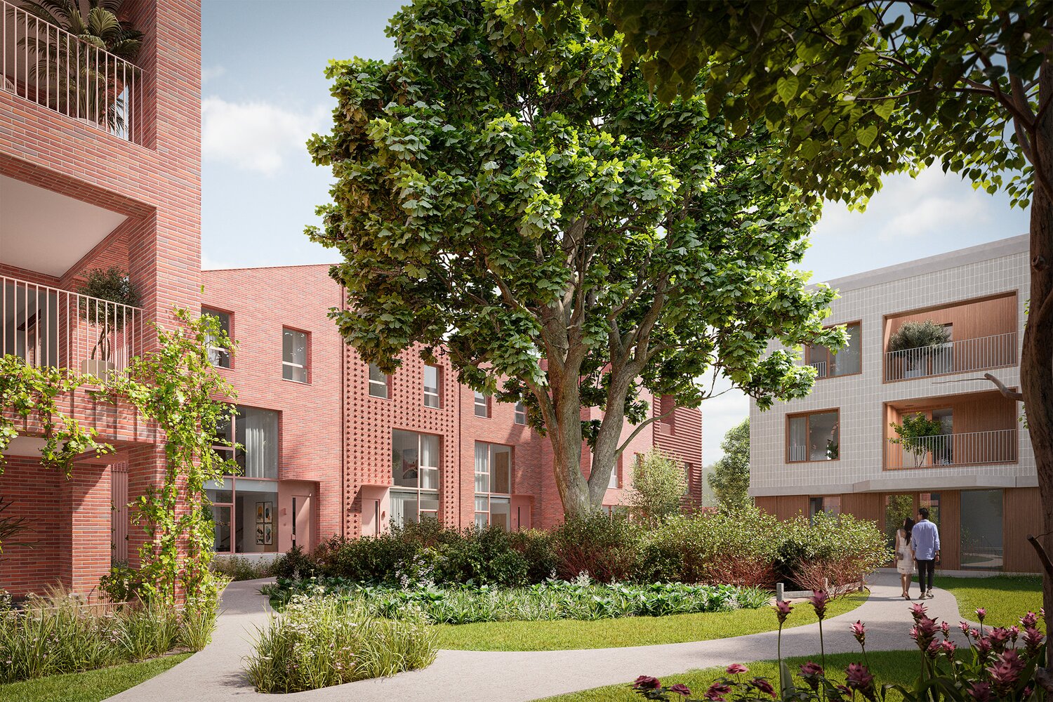 Hier woon je in het ritme van de seizoenen, met zicht op groen en het bruisende Mechelen vlakbij. De site ademt rust, maar leeft van verbondenheid. Het hart van het project vormt een weelderig binnengebied, ontworpen door landschapsarchitect Ars Horti. Oude lindes en een majestueuze tamme kastanjeboom blijven bewaard, een es krijgt een nieuwe plek. Samen creëren ze een natuurlijke luwte waar trage paden, speelplekken en ontmoetingsmomenten elkaar kruisen. Onder die kruinen vind je stijlvolle woningen en appartementen die met oog voor detail en duurzaamheid zijn ontworpen door dmvA architecten.