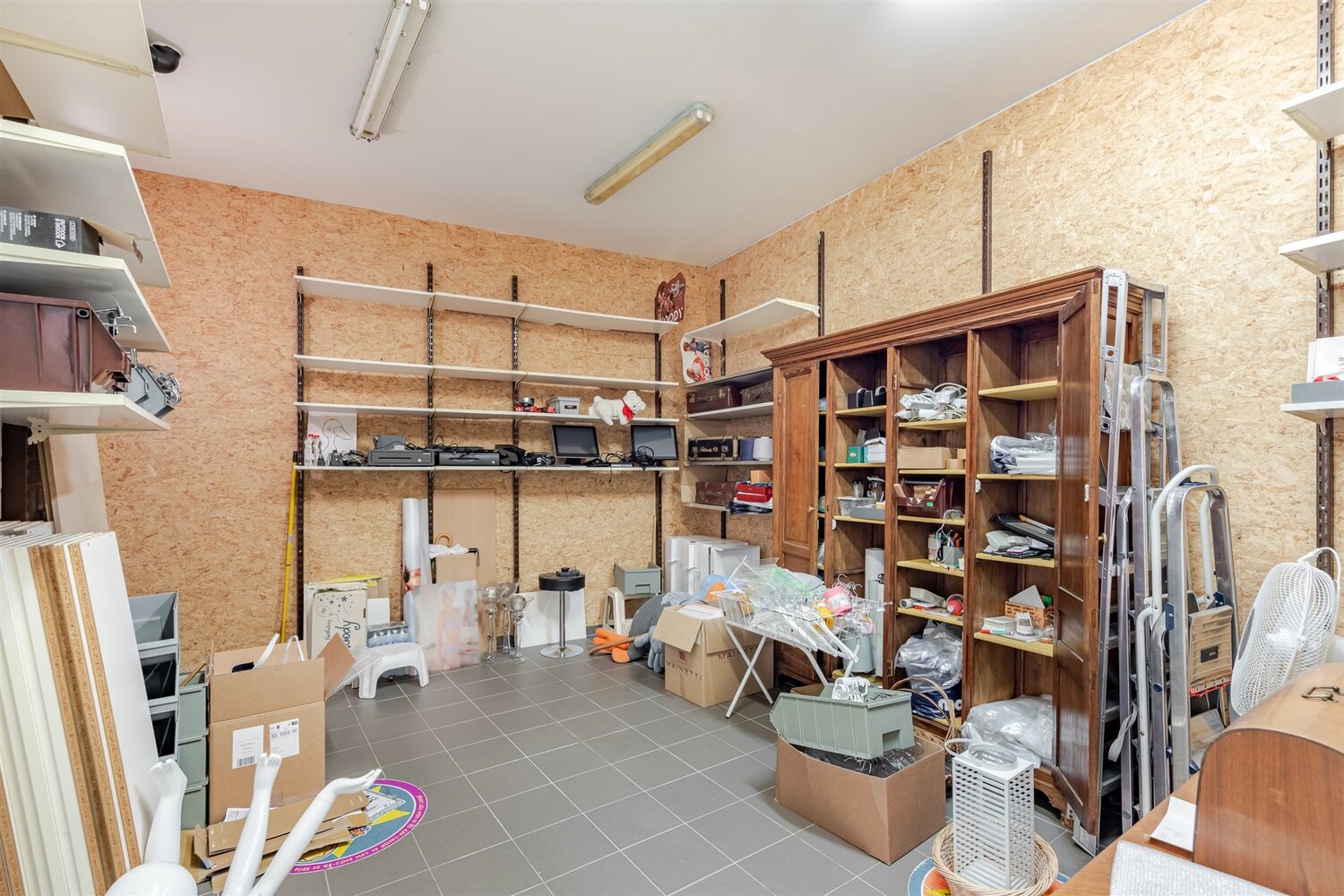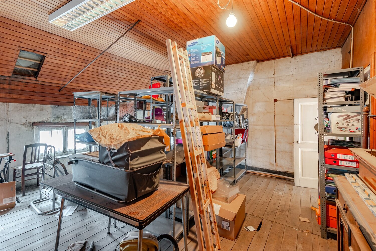 Op de eerste verdieping bevindt zich een bureel waar u in alle rust kan werken, aangevuld met een tweede keuken, een toilet, een badkamer en vier ruime stockageruimtes die alle praktische noden van uw zaak perfect ondersteunen. Daarbovenop beschikt het pand over een zolderverdieping die via een vaste trap bereikbaar is en die zich uitstekend leent tot bijkomende opslag of een verdere uitbreiding van de bestaande functies.