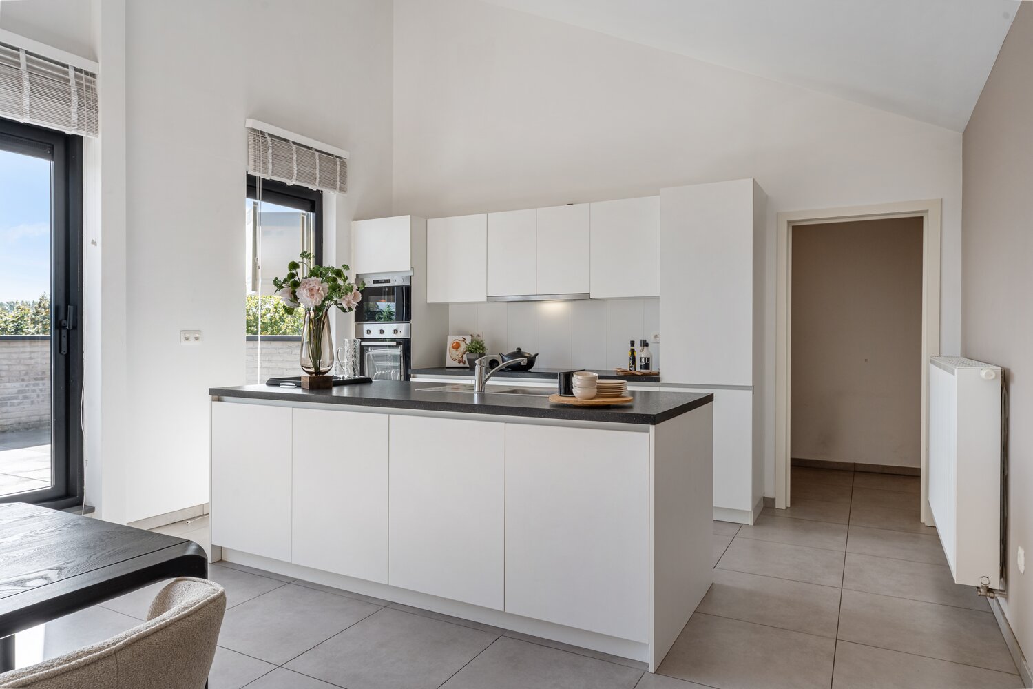 - Mooi verzorgde witte strakke keuken met spoeleiland, keramische kookplaat, afzuigkap, ingebouwde oven en micro-oven, vaatwasser en koelkast