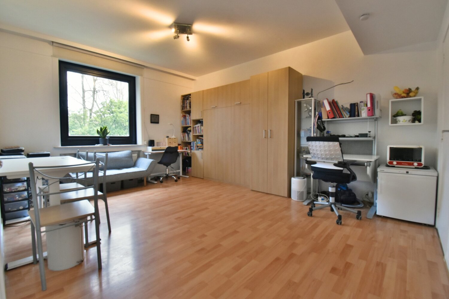 Deze flat, gelegen op het gelijkvloers, heeft een bewoonbare oppervlakte van +/-56m² en bestaat uit: woonkamer + eetkamer (+/-20m²)- keuken (elektrische kookplaat, dampkap, spoelbak, afwasmachine) (+/-9m²) - gastentoilet - kamer (+/-12m²) - badkamer (lavabo, bad) - bureauruimte (+/-6m²).