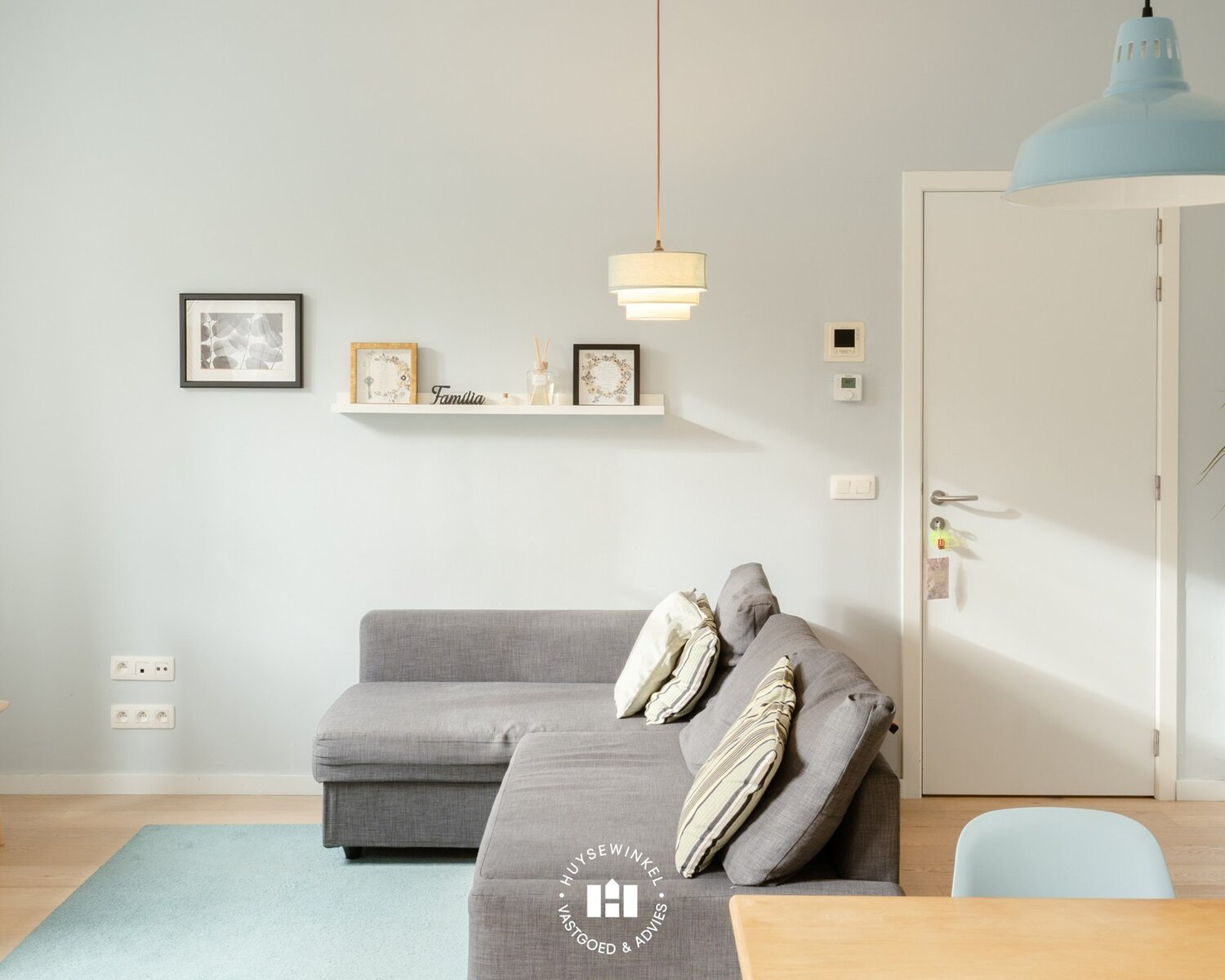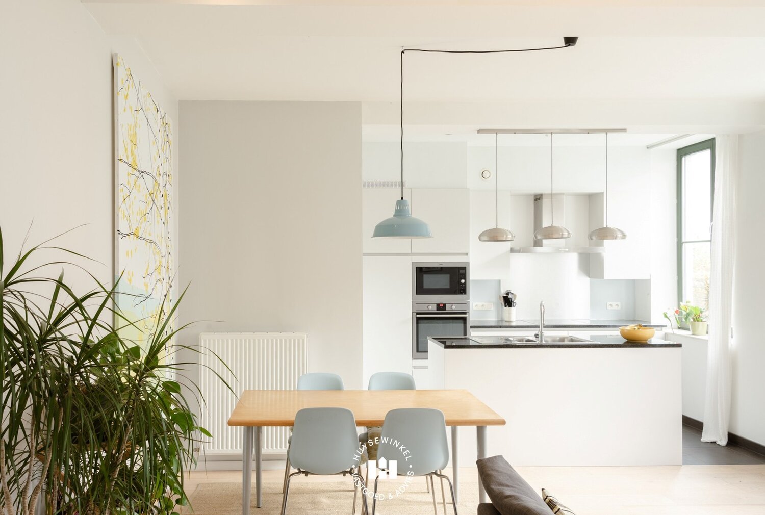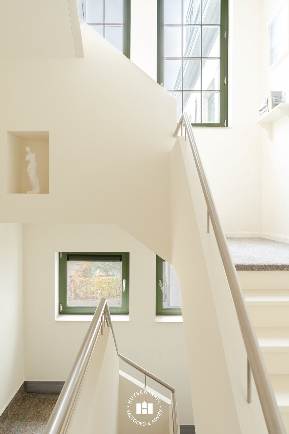 Het appartement biedt een open leefruimte met keuken en praktische keukenberging. Via de traphal met originele vloer betreed je de eerste verdieping, waar zich de badkamer en een ruime slaapkamer bevinden. Op de tweede verdieping vind je een tweede, eveneens royale slaapkamer.