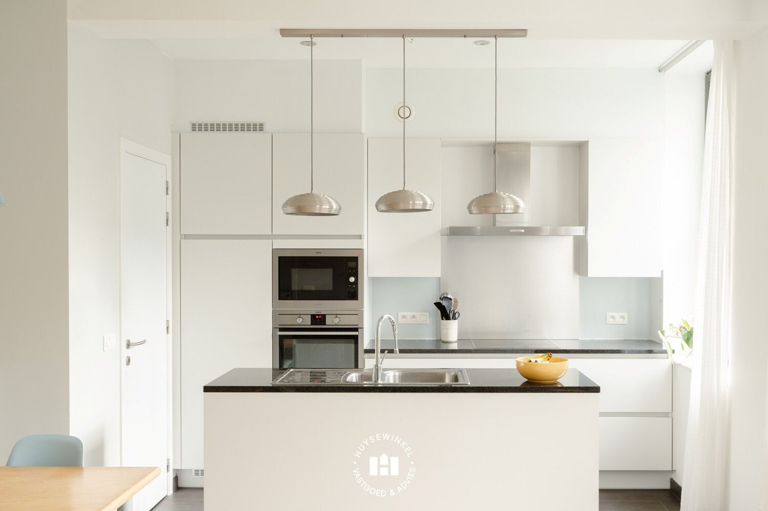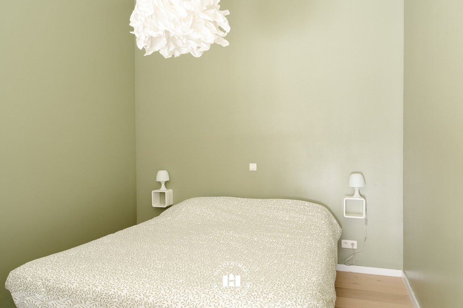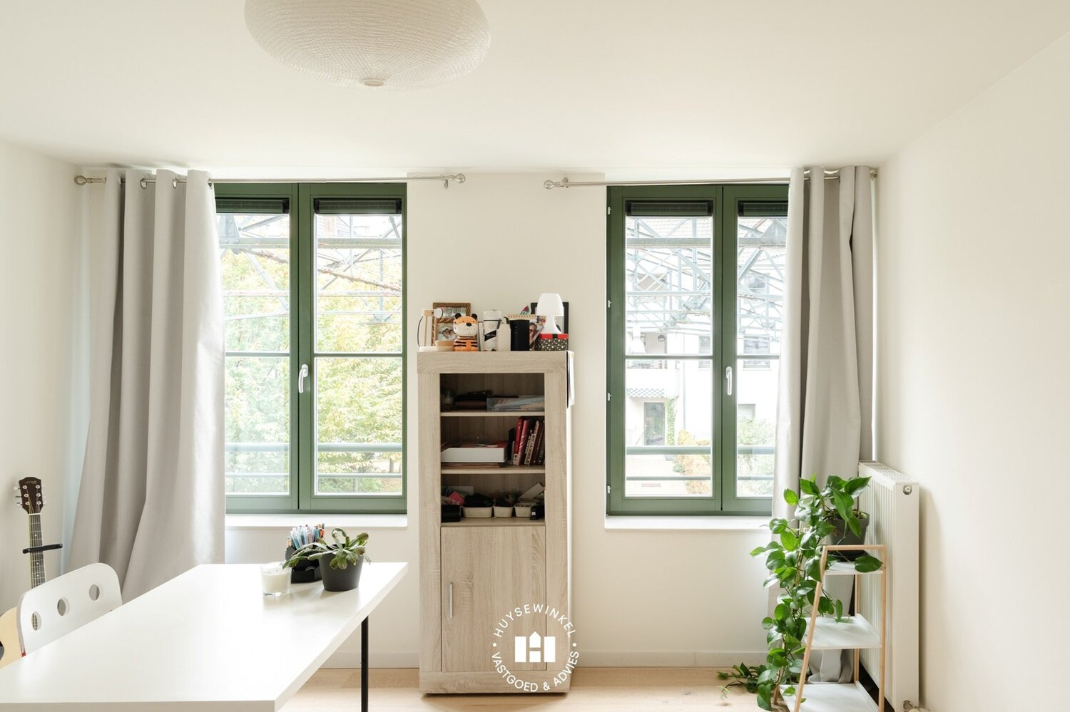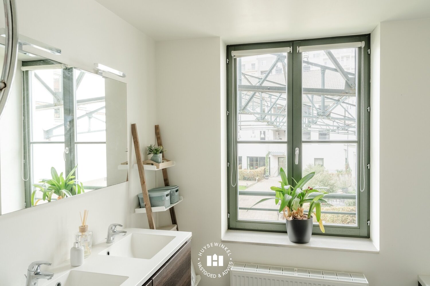 Dankzij de grote ramen geniet je van overvloedig daglicht en een prachtig zicht op het privatieve terras, volledig omgeven door groen. Bovendien is er toegang tot een gemeenschappelijke binnentuin, een rustige en uitnodigende plek waar bewoners elkaar ontmoeten in een ontspannen, groene setting.