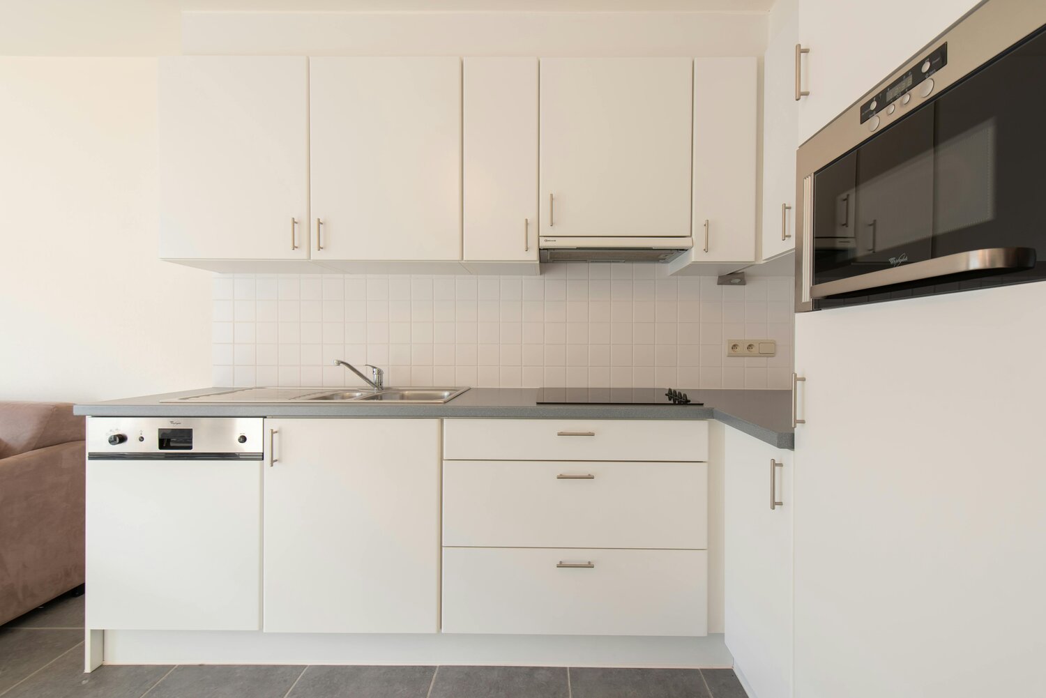 - open keuken met o.a. frigo met diepvriesvak, kookplaat, dampkap, microgolf en vaatwasmachine
