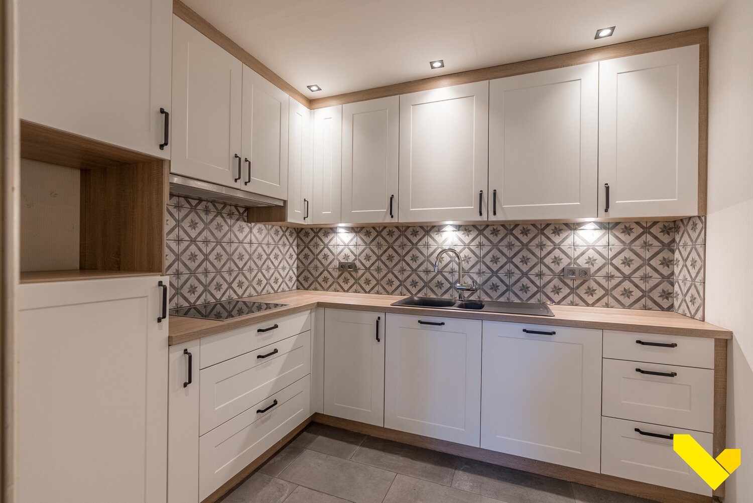Via de inkomhal kom je in de ruime en lichtrijke woonkamer, gekenmerkt door hoge plafonds die zorgen voor een open en luchtig gevoel. Aansluitend vind je de volledig vernieuwde keuken, uitgerust met moderne toestellen zoals een inductiekookplaat, ingebouwde dampkap, combi-oven, vaatwasser en koelkast – perfect voor wie graag kookt.