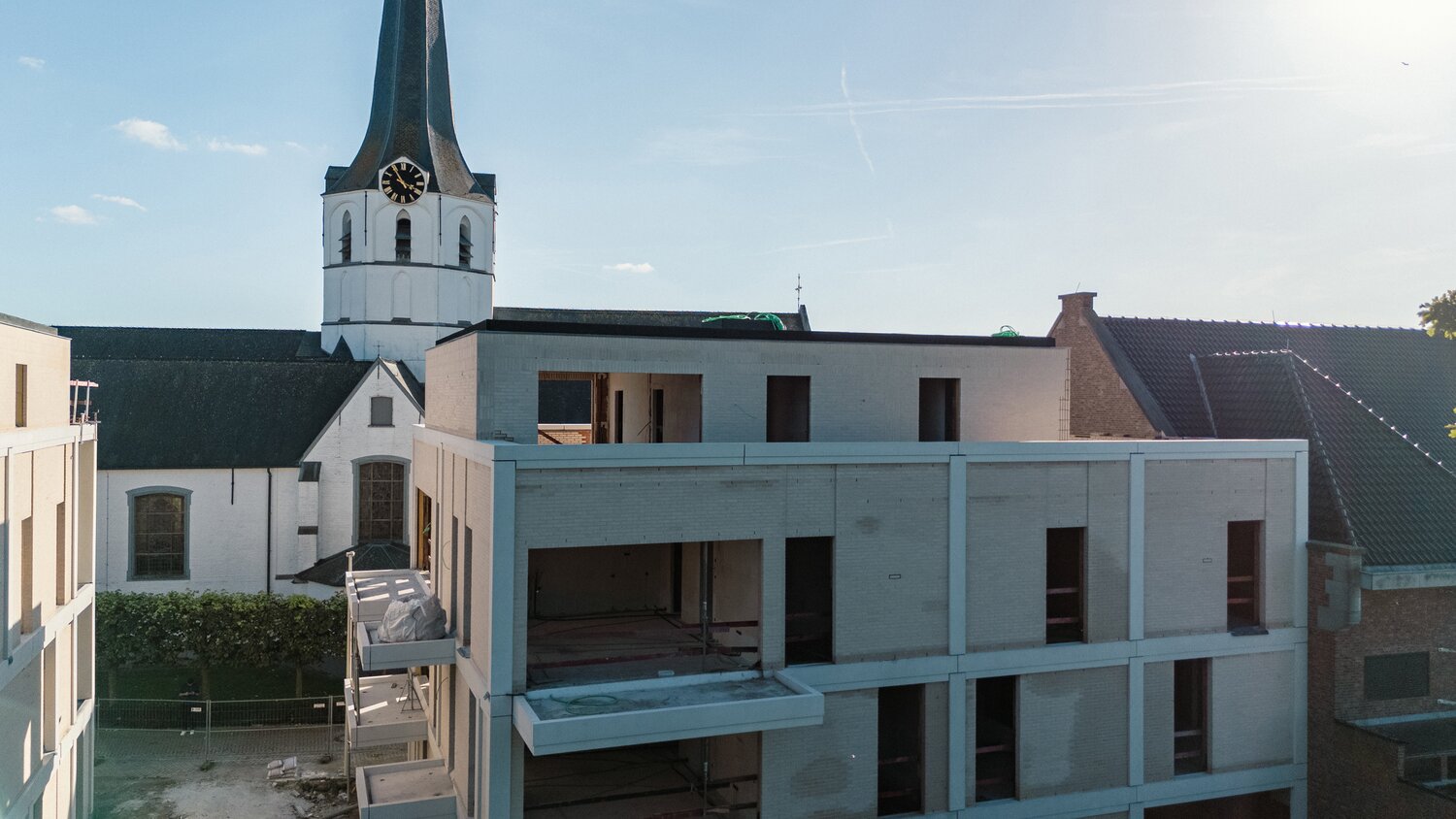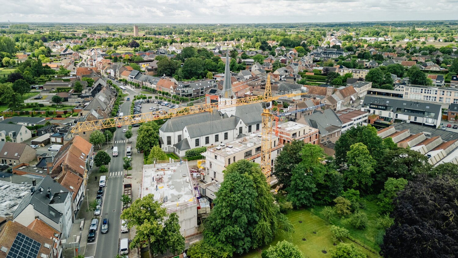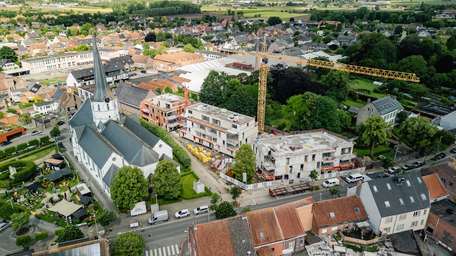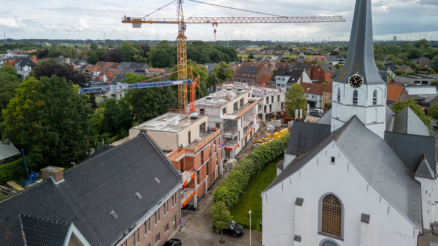 Nieuwbouwproject in het centrum van Sleidinge, effectief naast de kerktoren van Sleidinge, deelgemeente van Evergem.