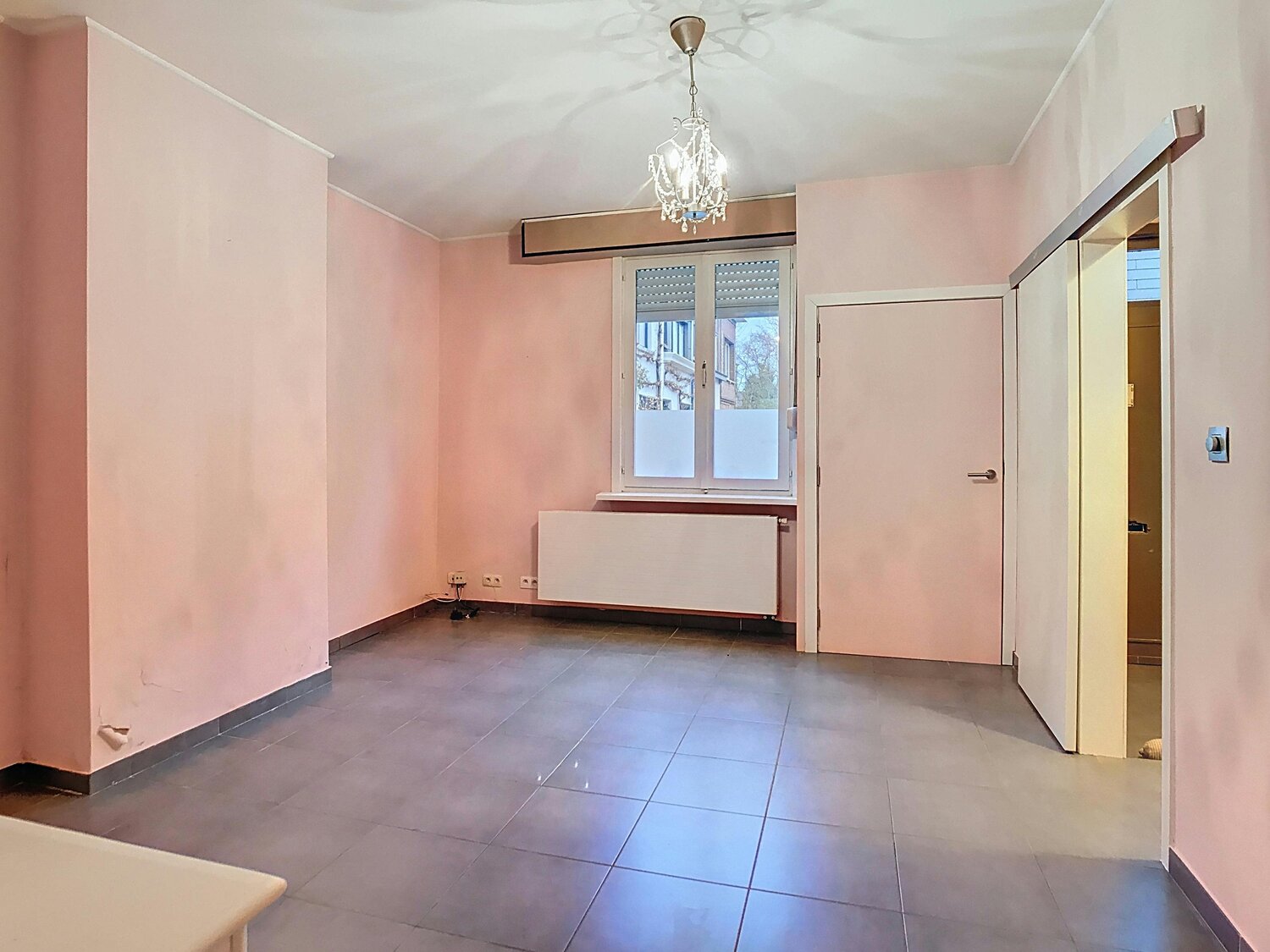 We betreden de woning via de inkomhal. De leefruimte bestaat uit een zithoek en een leefkeuken. De keuken is voorzien van de belangrijkste toestellen en biedt plaats aan een eettafel.