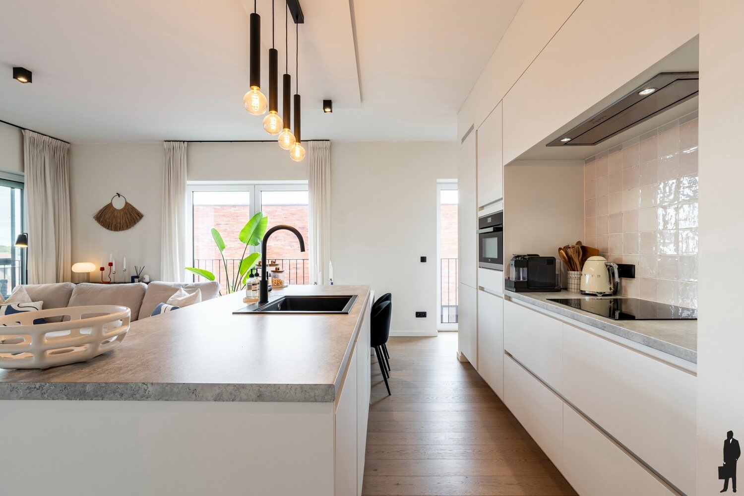 Dit prachtige appartement is gelegen op de 3e verdieping en is bereikbaar via zowel trap als lift. Via de inkomhal bereikt u de lichte en ruime leefruimte met open keuken. De keuken is volledig uitgerust, waaronder een ijskast/vriezer, combi-oven, een inductiekookplaat en een vaatwasser, evenals voldoende kastruimte. Naast de keuken bevindt zich een ruime berging/technische ruimte met plaats voor opslag, wasmachine en droogkast.