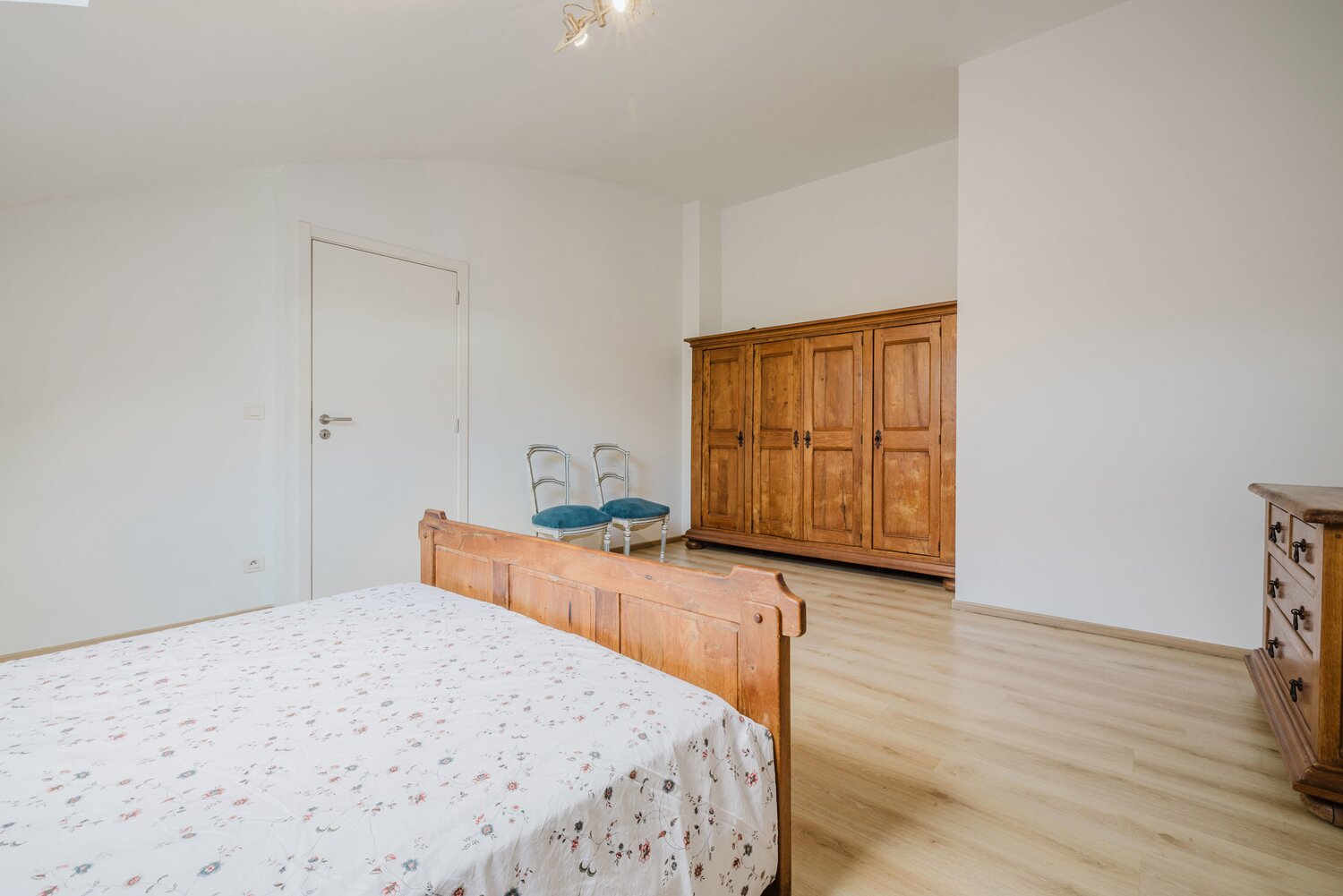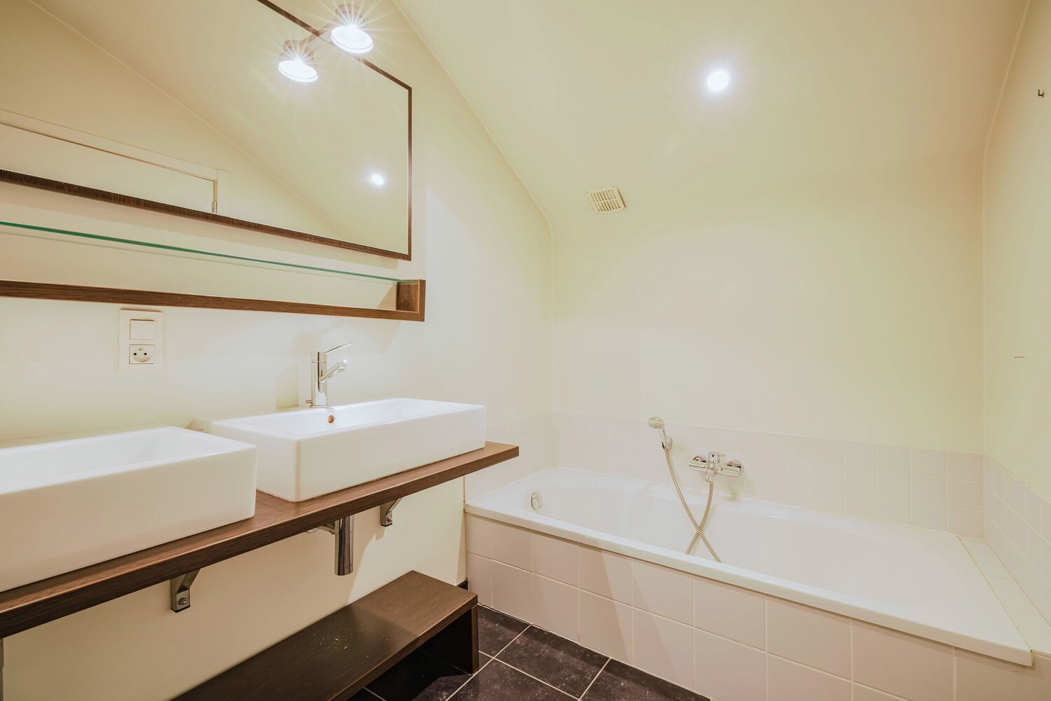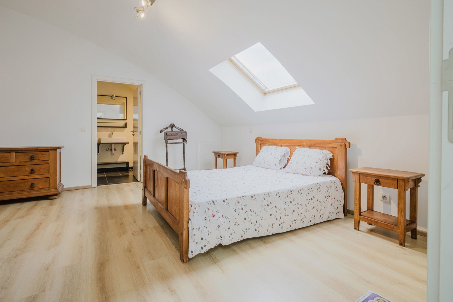 Via de open trap bereik je de tweede verdieping, waar twee volwaardige slaapkamers rust en privacy bieden. De masterbedroom beschikt over een ensuite badkamer met ligbad, dubbele lavabo en inloopdouche. Daarnaast is er nog een tweede douchekamer aanwezig. Tussen beide kamers bevindt zich een open, multifunctionele ruimte — ideaal als bureau of hobbyruimte.