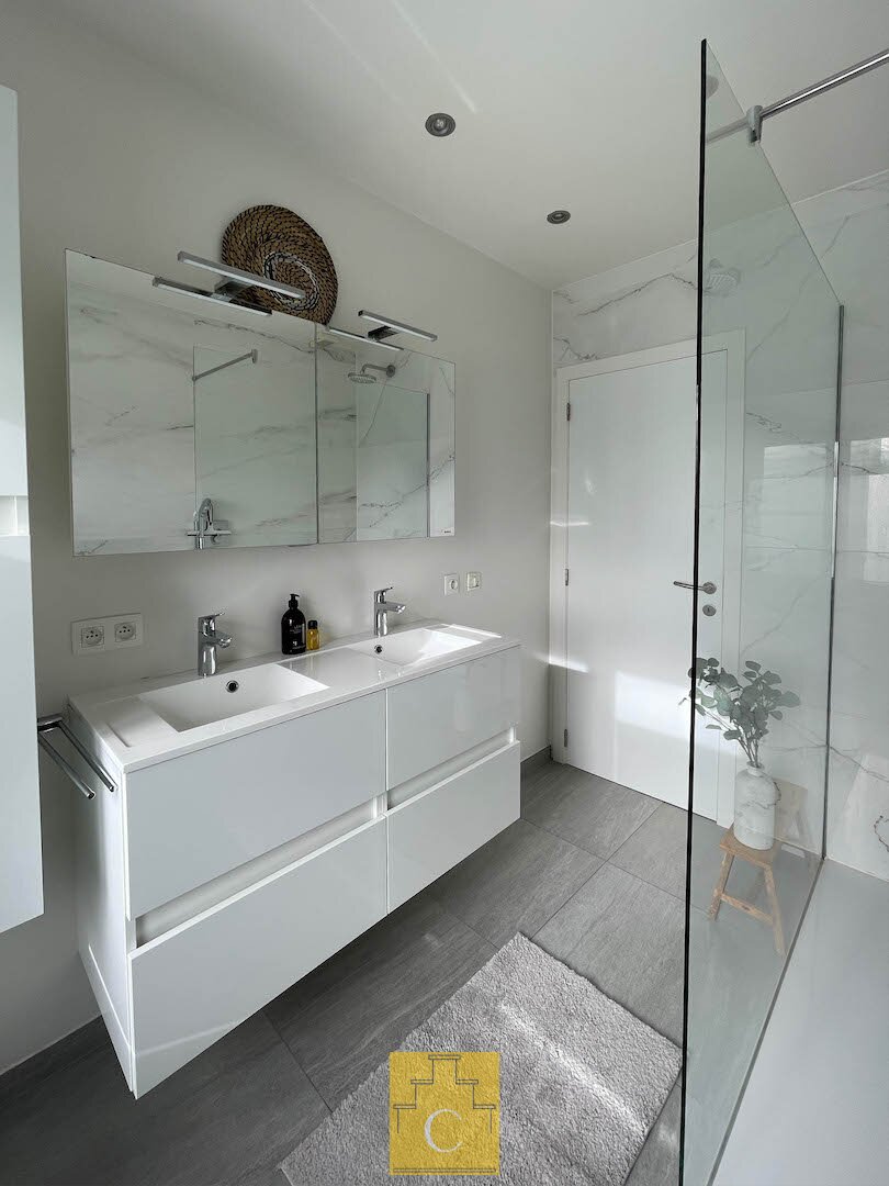 De tweede verdieping omvat twee ruime slaapkamers, dressing en een badkamer met inloopdouche, toilet, dubbele lavabo in meubel en spiegelkast.