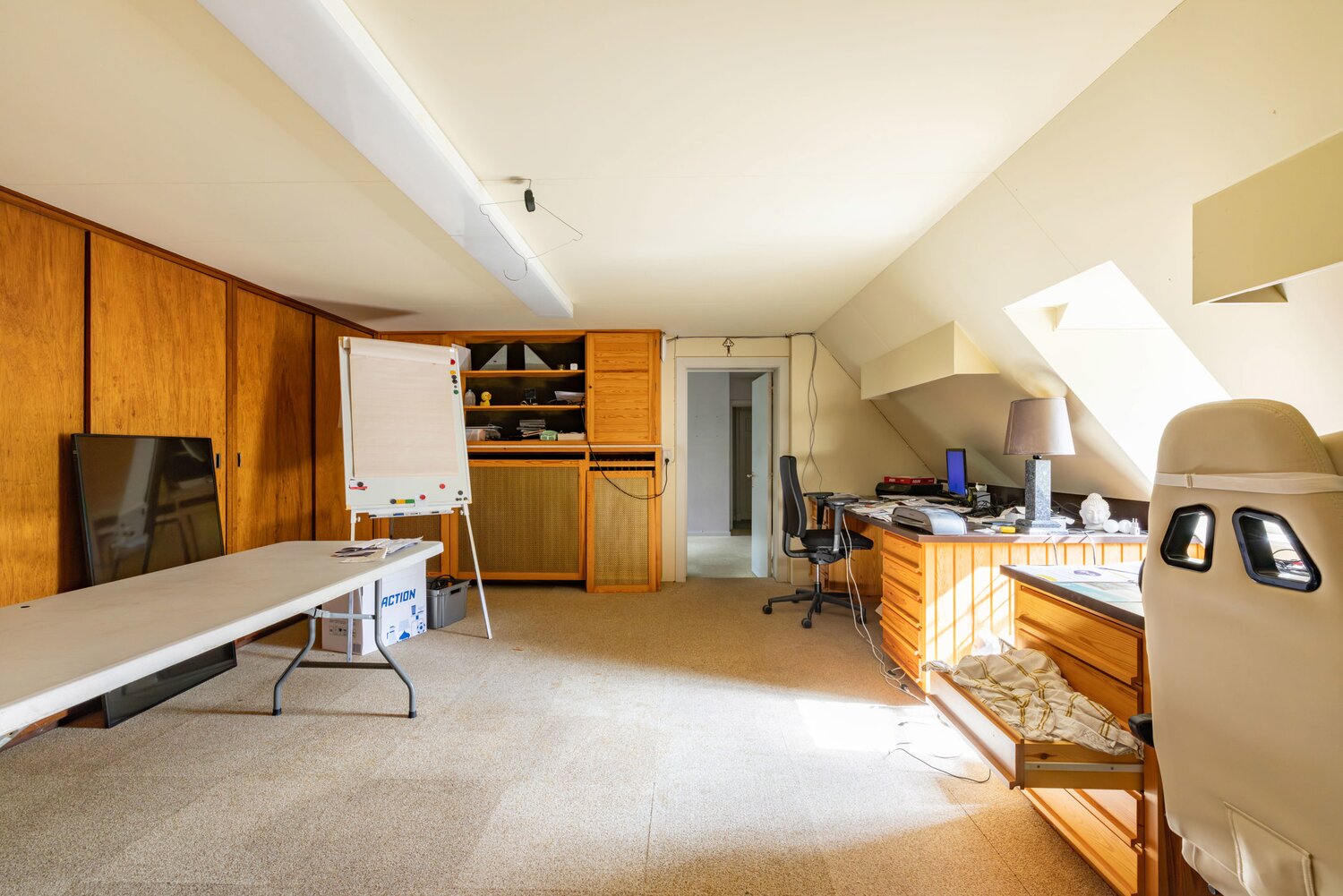 Deze villa was een voormalige notaris woning met kantoor. Het gelijkvloers bestaat uit een royale inkomhal, vestiaire en toilet, een grote woonkamer, een ingerichte keuken, 2 polyvalente kamers, een wasberging, fietsplaats, een grote kantoor ruimte en een dubbele garage. Op het eerste verdiep zijn er 8 slaapkamers en 2 badkamers voorzien. Ook de zolderruimte voorziet tal van plaats en kan nog afgewerkt worden met tal van doeleinden. Bovendien is de woning onderkelderd en geniet deze van een zuidwest gerichte tuin.