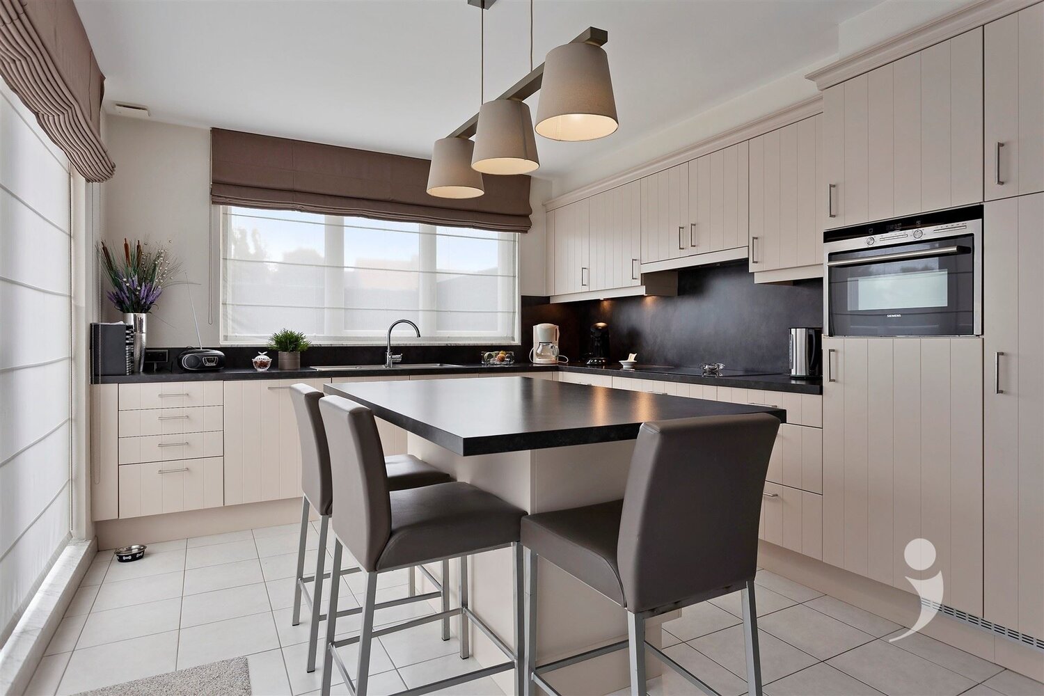 De prachtige keuken, voorzien van alle comfort, is uitgerust met een vaatwasser, kookplaat, combi microgolfoven, frigo en zeer veel kastruimte.