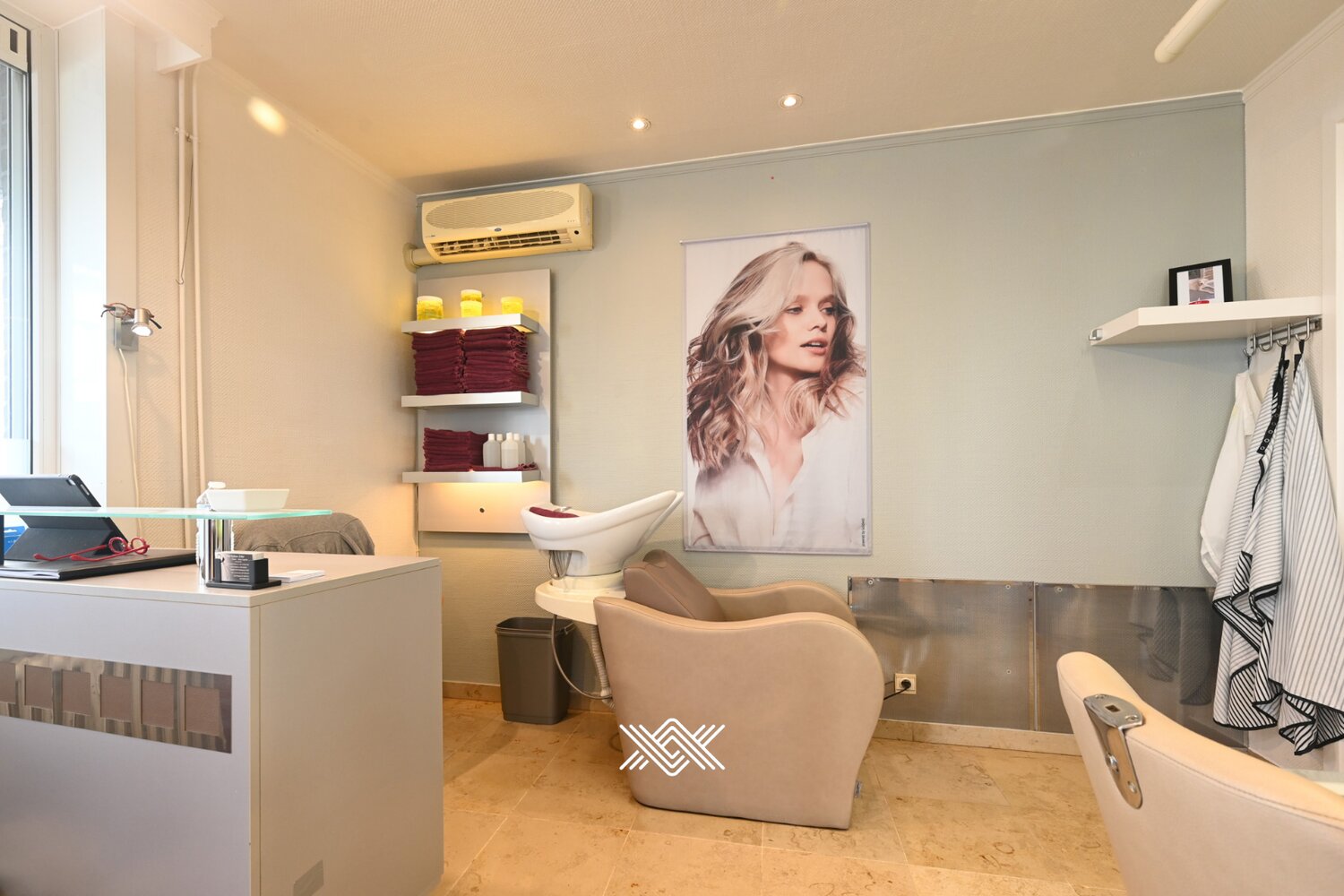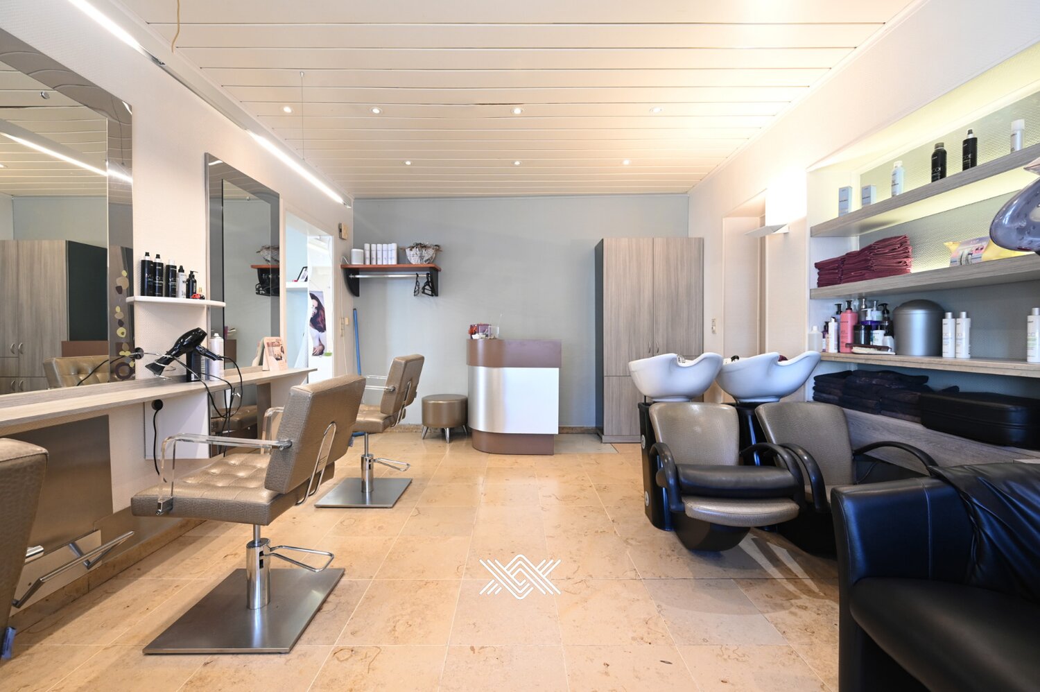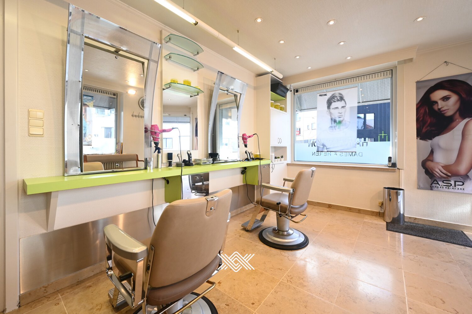Het gelijkvloers omvat een volledig ingericht kapsalon, instapklaar voor wie een bloeiende zaak wil verderzetten of een eigen concept wil uitbouwen. Naast het kapsalon bevindt zich een studio met aparte ingang, voorzien van een leefruimte, keuken, badkamer en toilet. Het handelshuis kan ook volledig omgevormd worden tot een eengezinswoning (zonder commerciële plint).