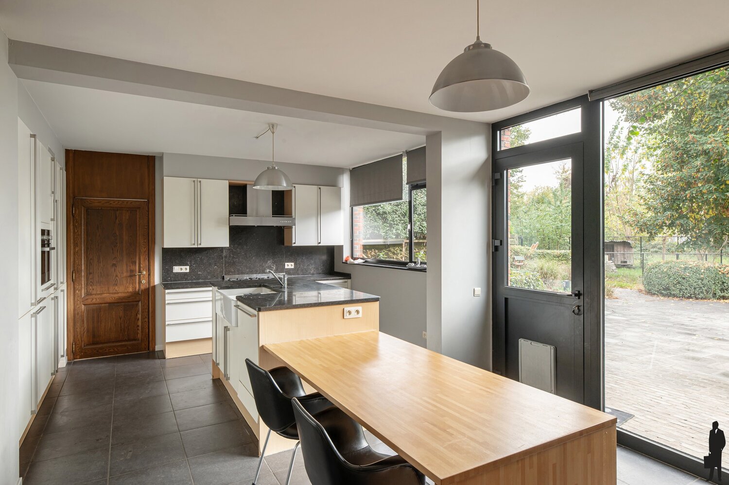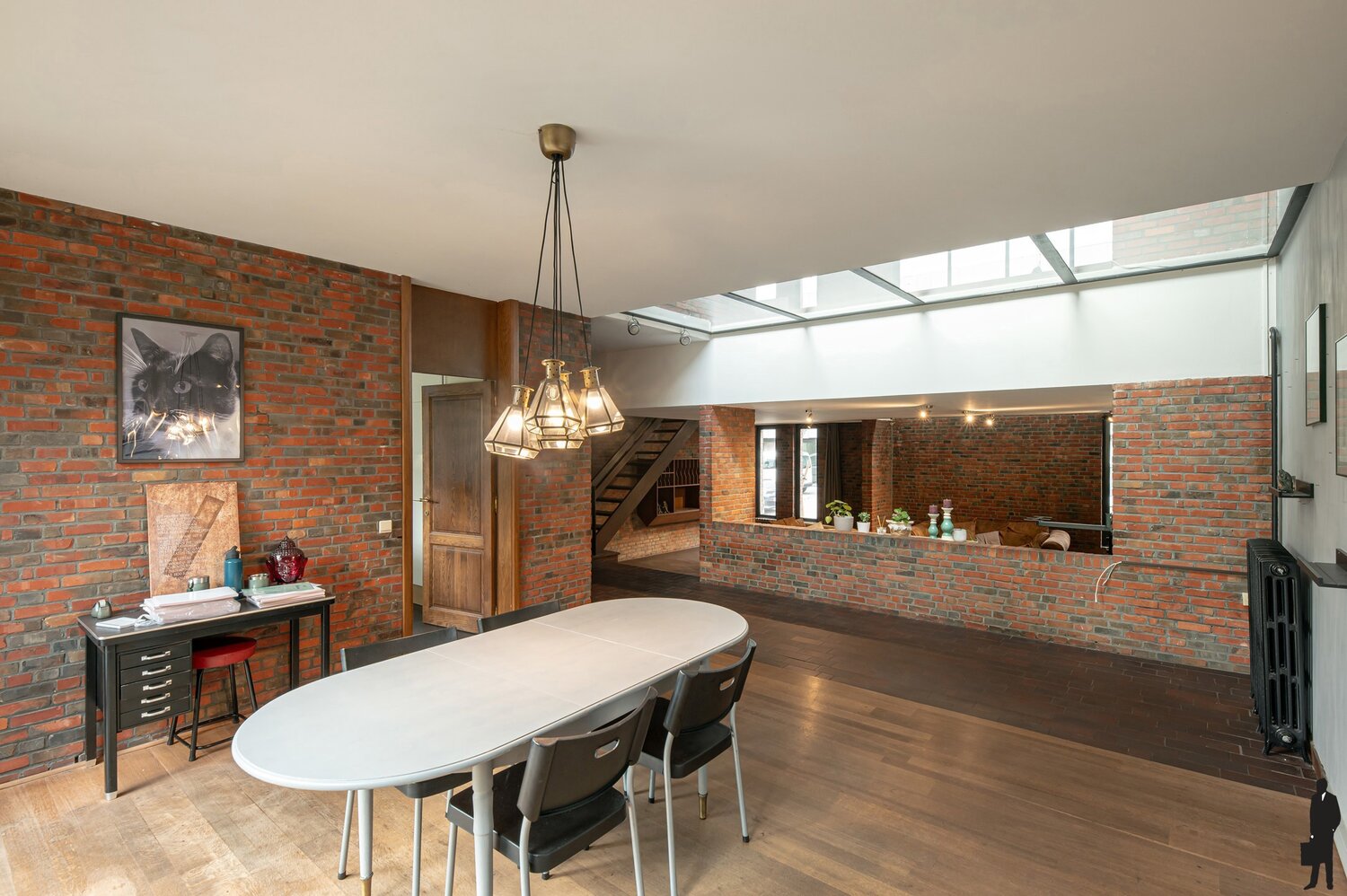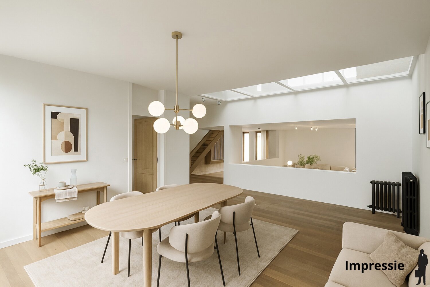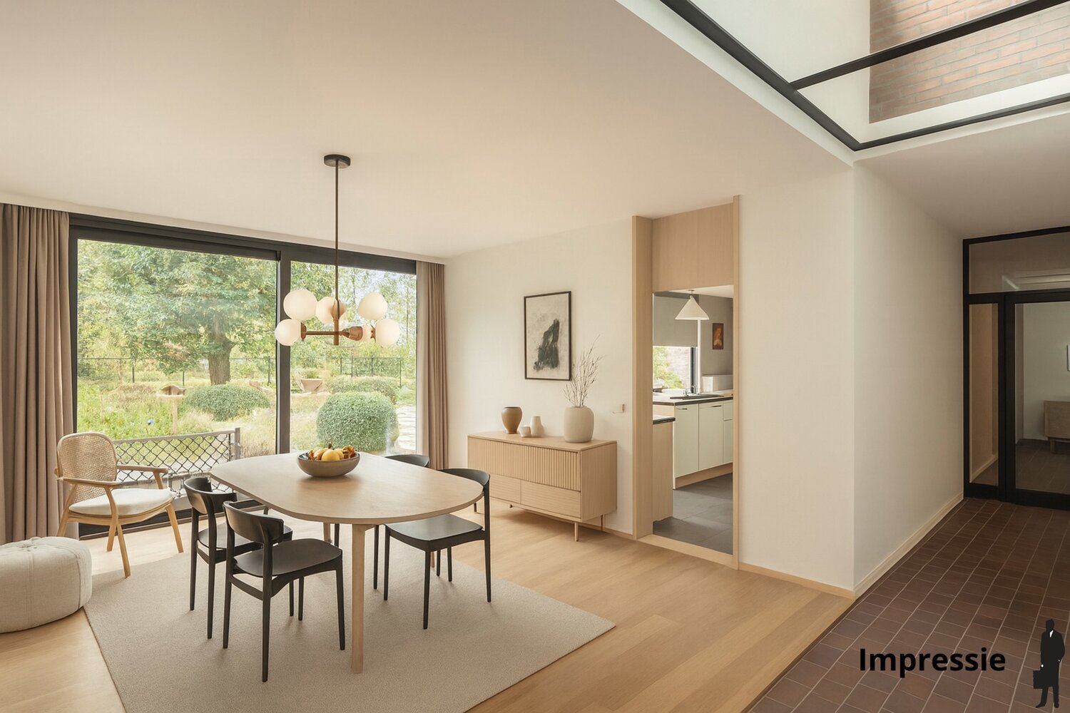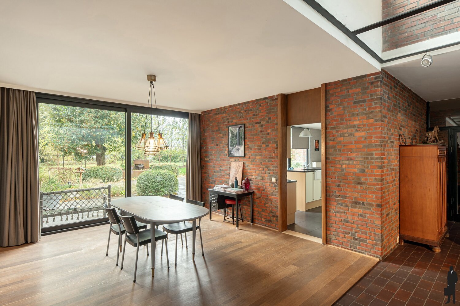 - Een eetkamer op parket met groot schuifraam met directe toegang tot de tuin