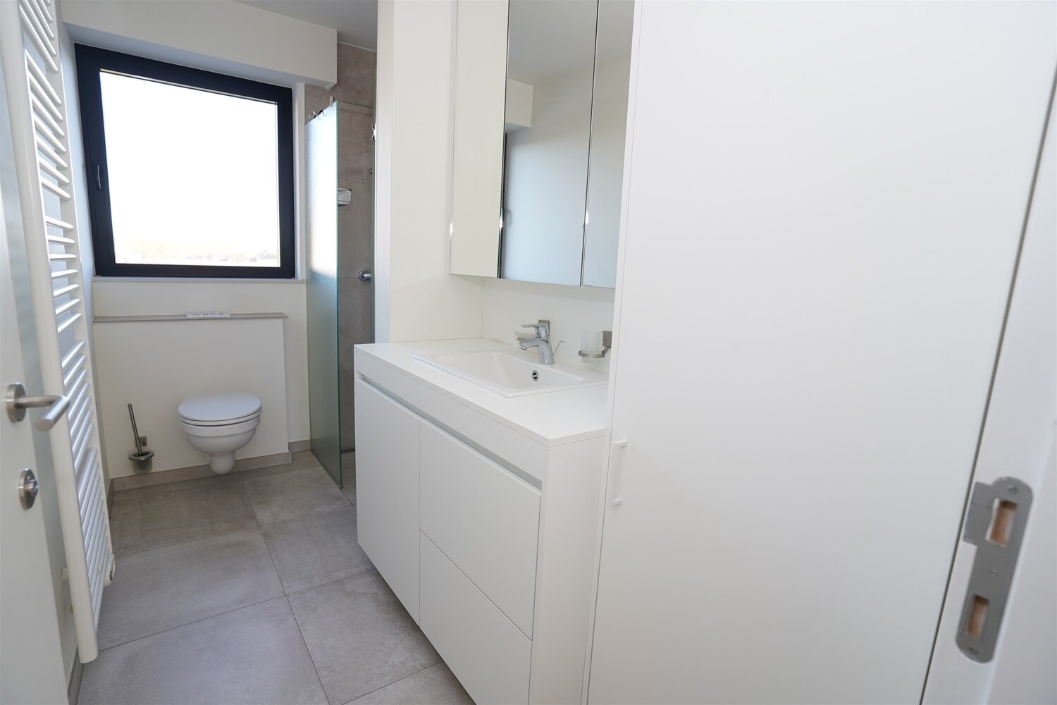 Bereikbaar met lift: inkomhal met gastentoilet - volledige rolstoeltoegankelijk en voorzien van videofoon - Een lichte living dankzij grote panoramische ramen.