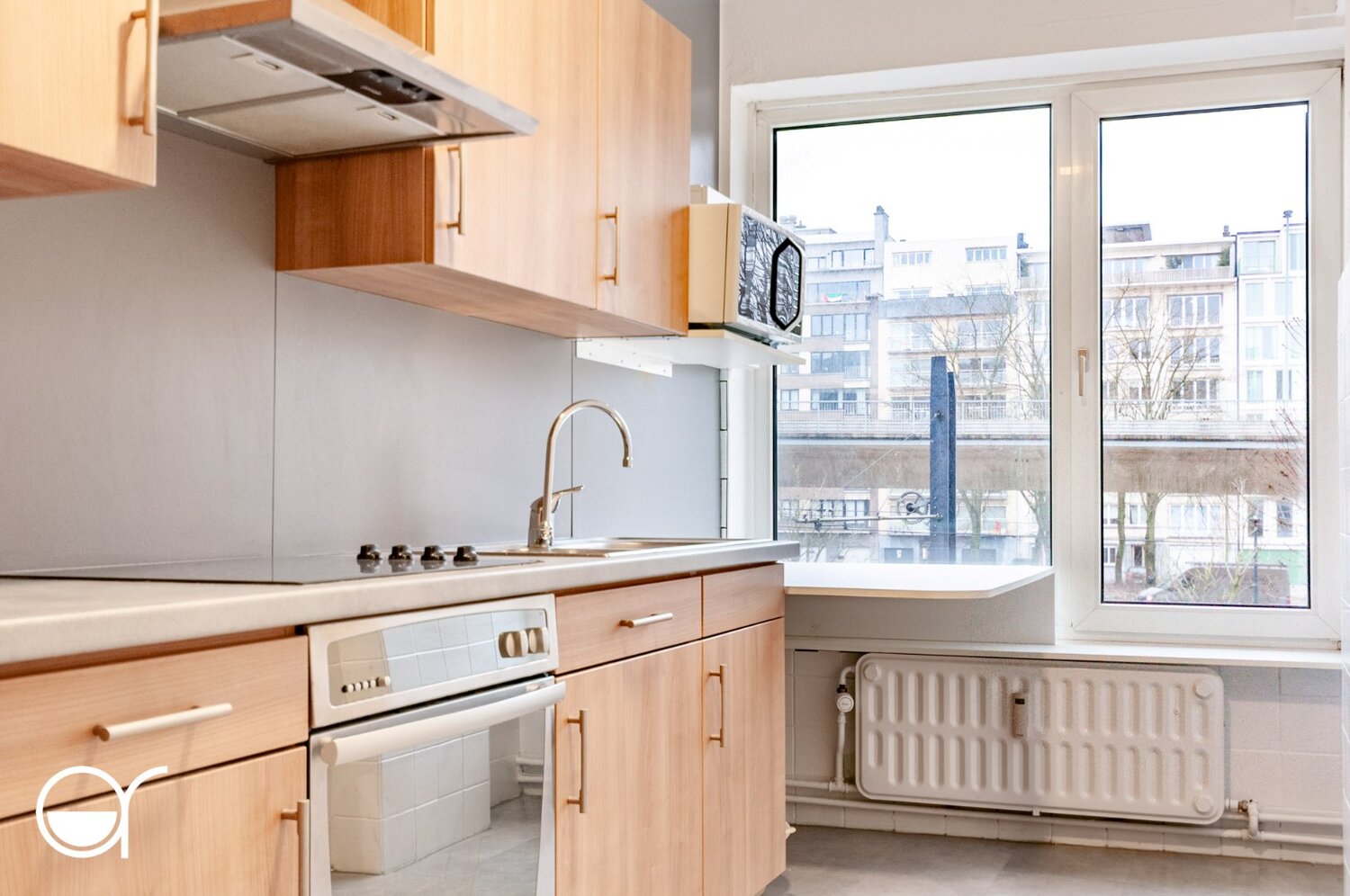 Via de inkomhal betreedt u via een charmante tussendeur de ruime woonkamer met aangename lichtinval. Aansluitend bevindt zich de geïnstalleerde keuken, uitgerust met een koelkast, elektrische kookplaat, oven, dampkap, spoelbak en microgolfoven.