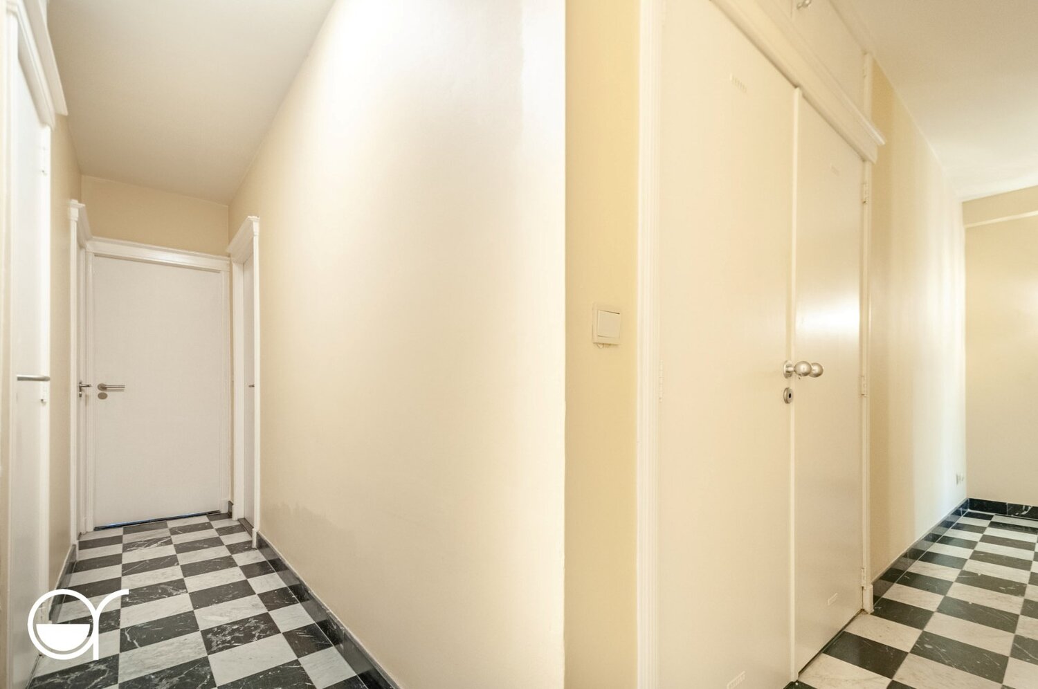 De nachthal, afgewerkt met een karaktervolle tegel in dambordpatroon en voorzien van ingemaakte kasten, geeft toegang tot een apart gastentoilet en de badkamer. Deze laatste is voorzien van een ligbad met douche, toilet en wastafel. Verder beschikt het appartement over twee volwaardige slaapkamers, die beide uitgeven op een terras.