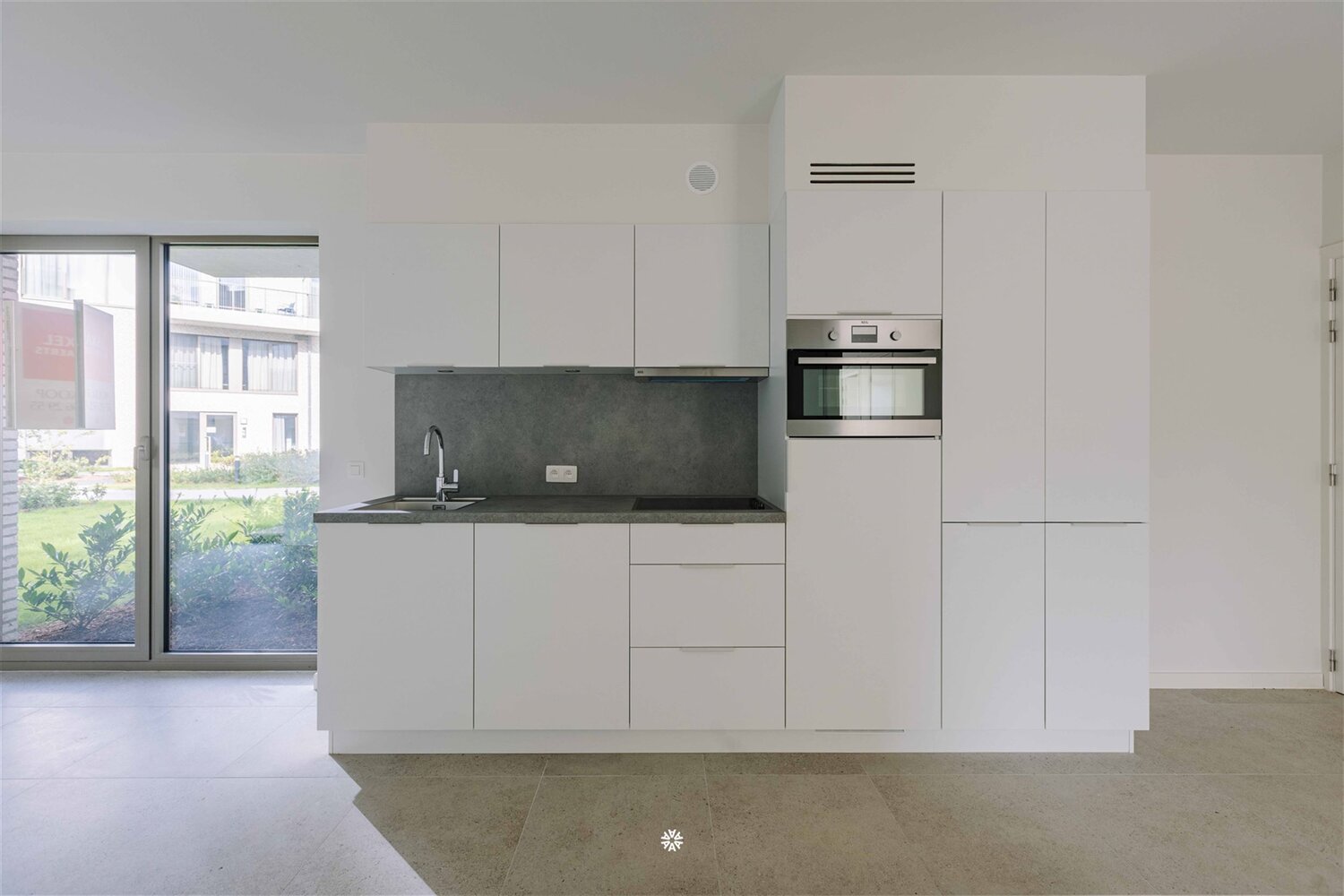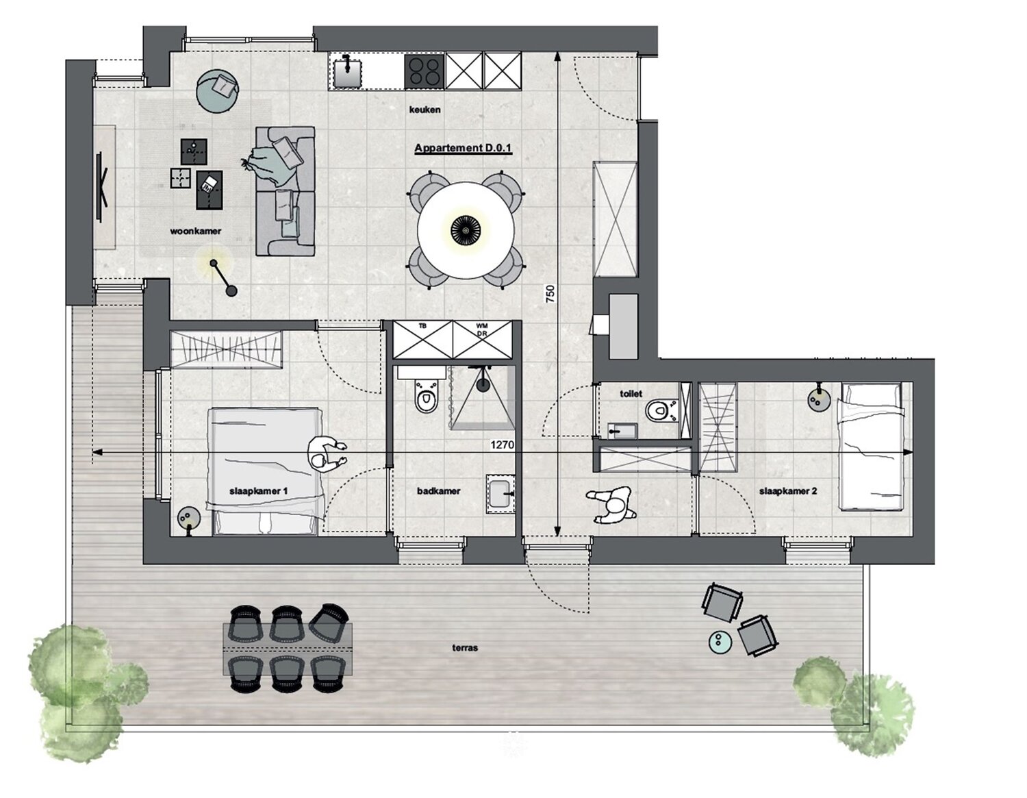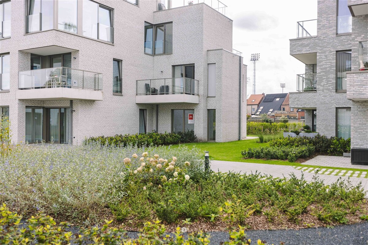 Het appartement is gelegen op de gelijkvloerse verdieping en omvat een zeer ruime leefruimte met open goed uitgeruste keuken (kookplaat, vaatwasser, koelkast en combi-oven). Verder beschikt het appartement over twee slaapkamers waarvan één met ensuite badkamer. Apart toilet en technische ruimte. Het appartement beschikt over een zeer ruim en zonnig leefterras van 20m².