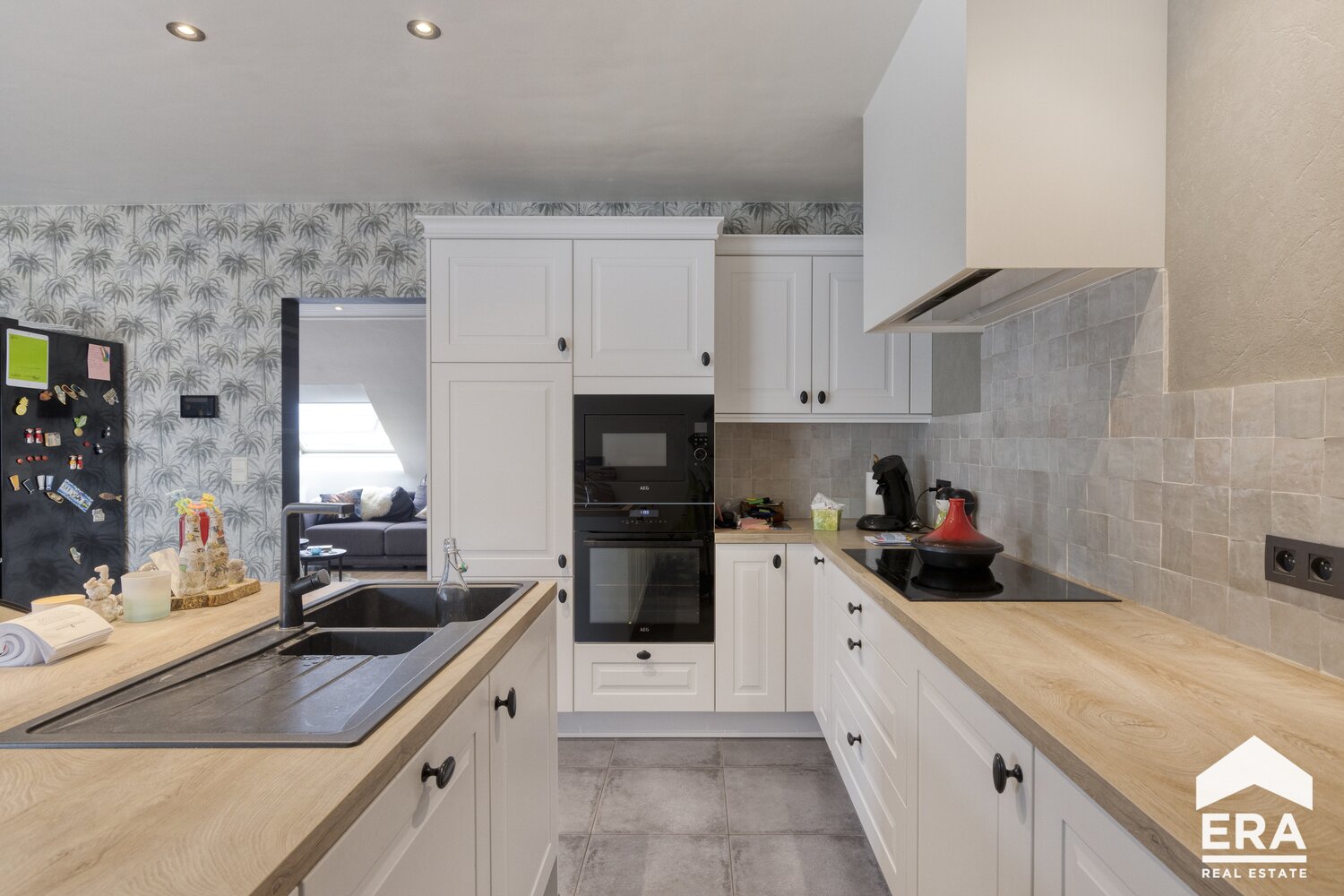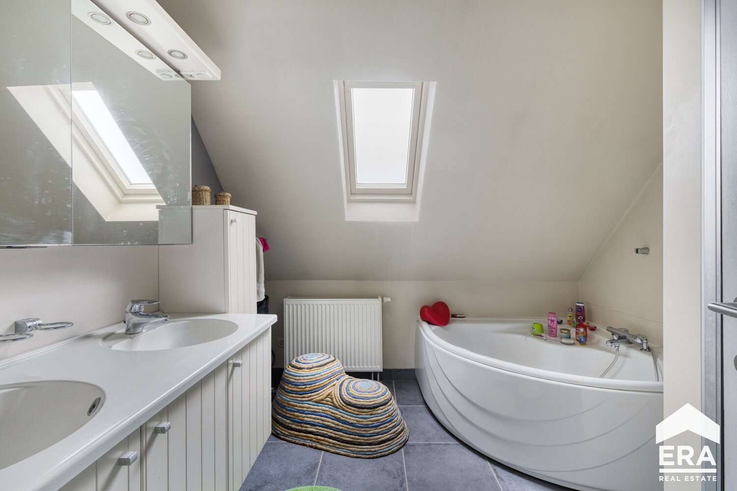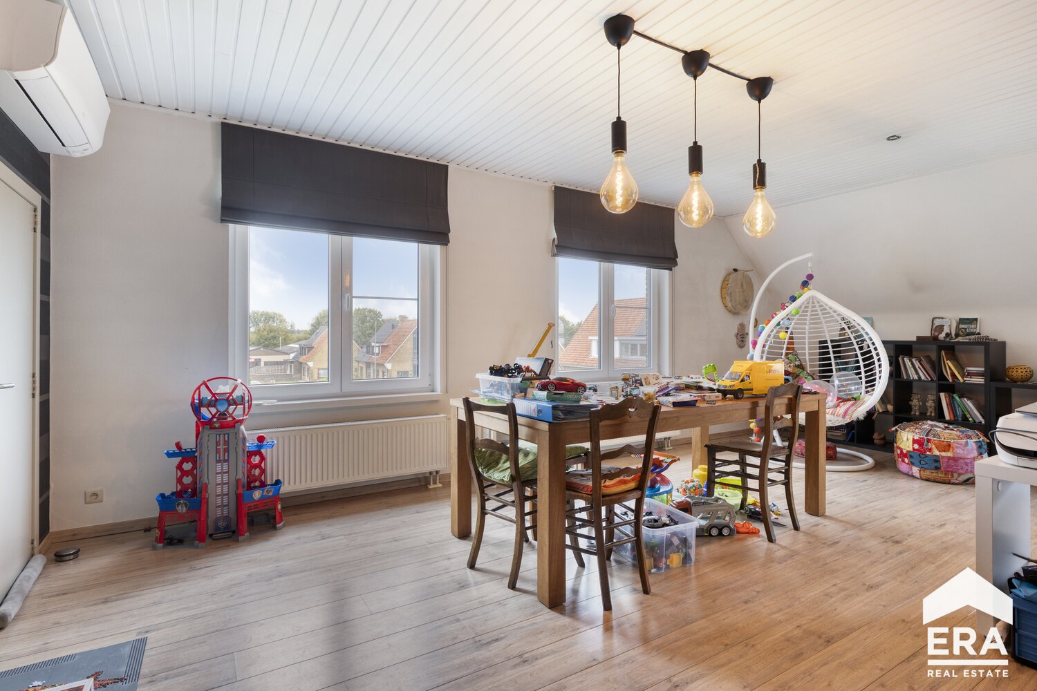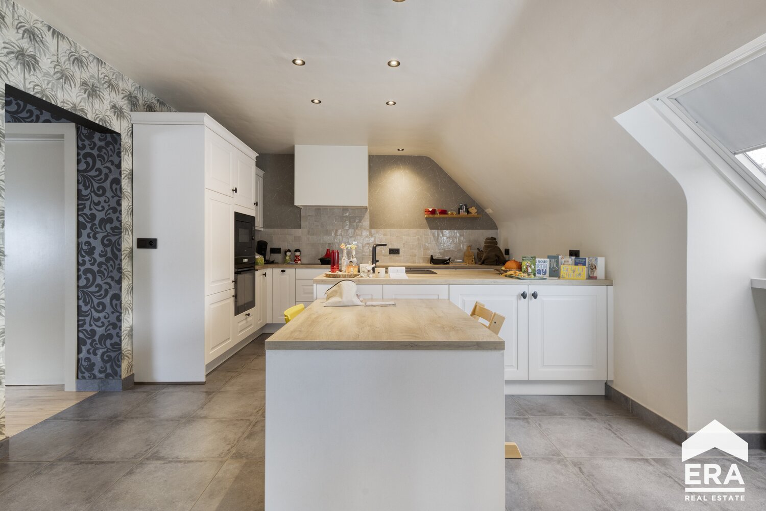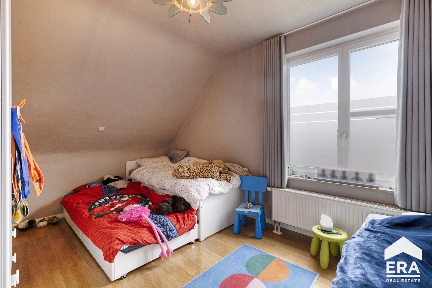 Op de eerste verdieping bevindt zich een ruim en lichtrijk appartement met vier comfortabele slaapkamers, telkens voorzien van ingebouwde kasten of een praktische dressing. De volledig uitgeruste keuken sluit naadloos aan op de leefruimte en de moderne badkamer biedt zowel een bad als douche, ideaal voor gezinnen of wie houdt van comfort en functionaliteit. De gemeenschappelijke inkomhal zorgt bovendien voor een verzorgde en toegankelijke entree.