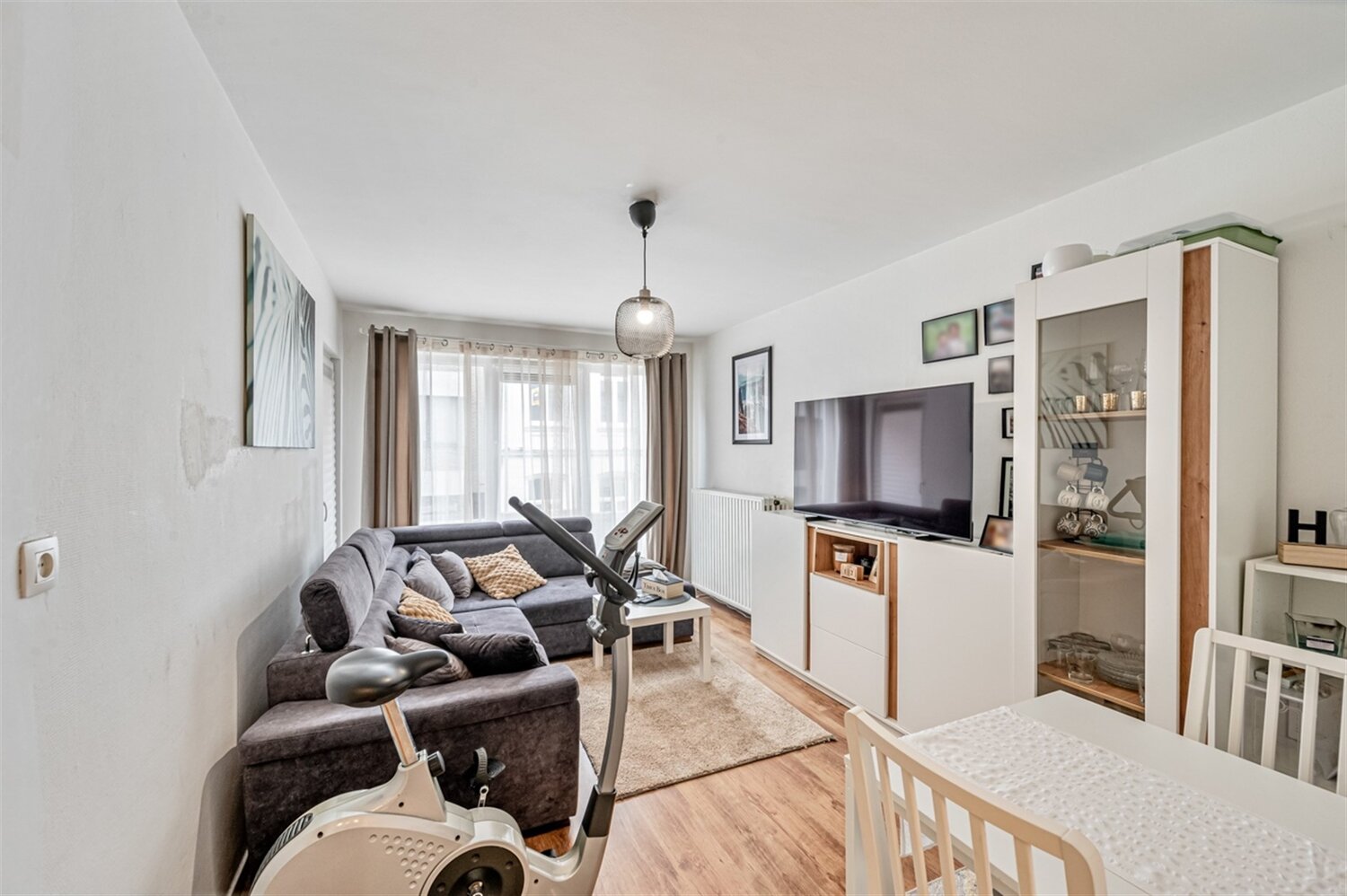 Via de inkomhal betreedt men het appartement, dat uitblinkt door een logische indeling en een aangename lichtinval. De woonkamer vormt het hart van de woonst en biedt een gezellige leefruimte met voldoende plaats voor een zithoek en eetruimte. Aansluitend bevindt zich de keuken, die functioneel is ingericht en in directe verbinding staat met de leefruimte. Het appartement beschikt over twee slaapkamers, die flexibel inzetbaar zijn als slaap-, werk- of hobbyruimte. De badkamer is praktisch ingericht en vervolledigt het wooncomfort. Tot slot is er een klein terras aanwezig, ideaal om even tot rust te komen of van de buitenlucht te genieten.