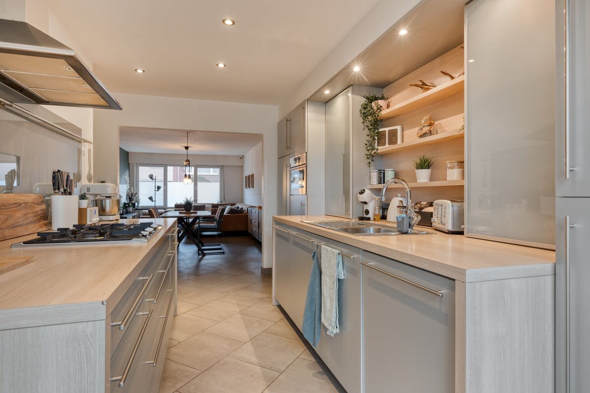 - Keuken voorzien van een gasvuur, combi-oven, dubbele spoelbak, koelkast en diepvries