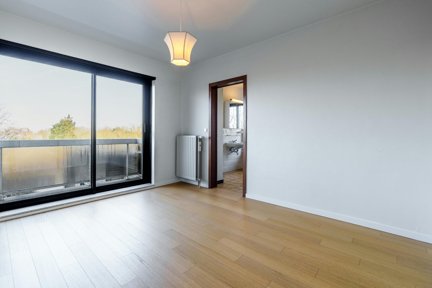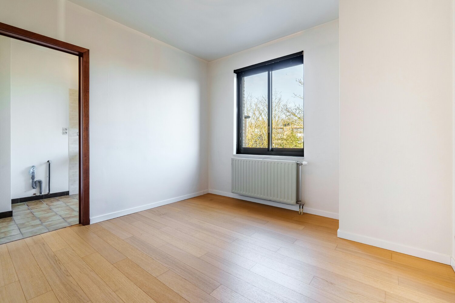- Lichtrijke woonkamer met nieuwe massief houten parketvloer en grote raampartijen (prachtig zicht op de torens van Ieper)
