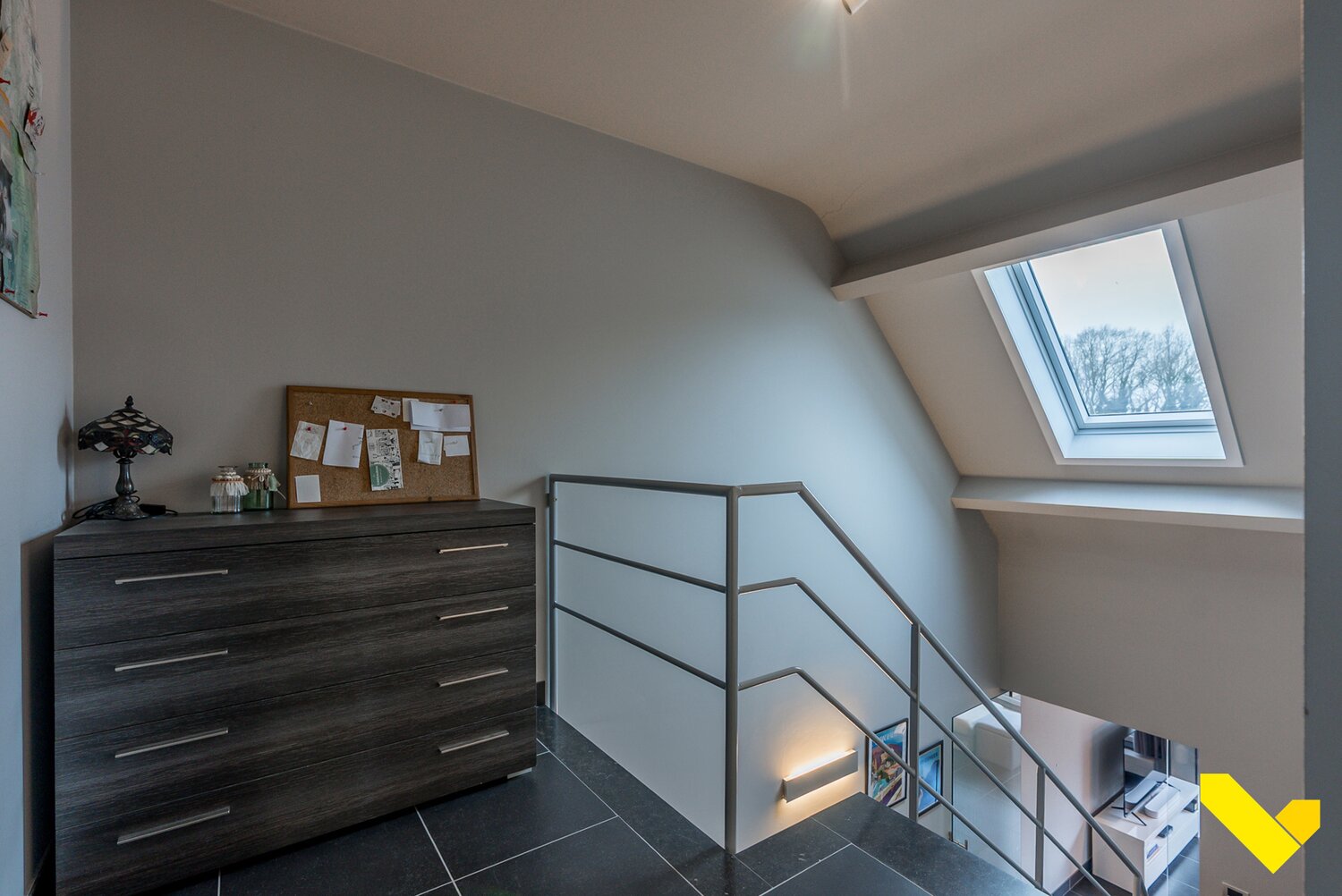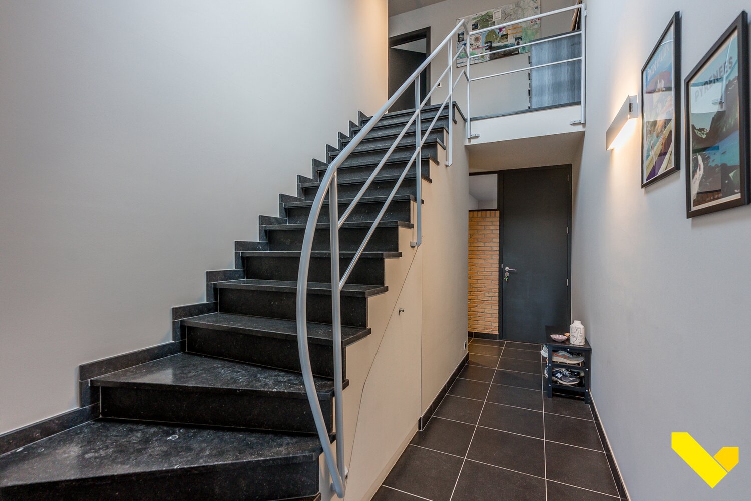 Op de eerste verdieping komt u binnen via de inkomhal die toegang geeft tot de lichtrijke leefruimte met plaats voor zowel een salon als een eetkamer. Aansluitend bevindt zich de open, volledig ingerichte keuken met alle nodige toestellen. Naast de keuken is er een praktische berging met aansluiting voor wasmachine en droogkast.