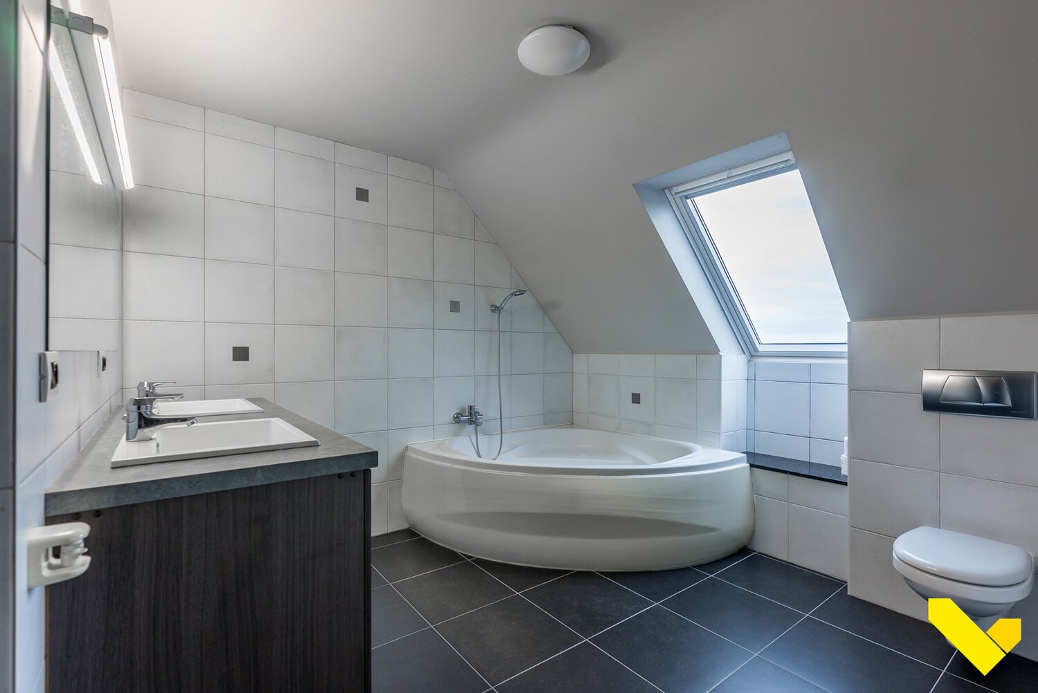 De tweede verdieping beschikt over twee volwaardige slaapkamers en een ruime badkamer uitgerust met een groot hoekbad, dubbele wastafel en toilet.