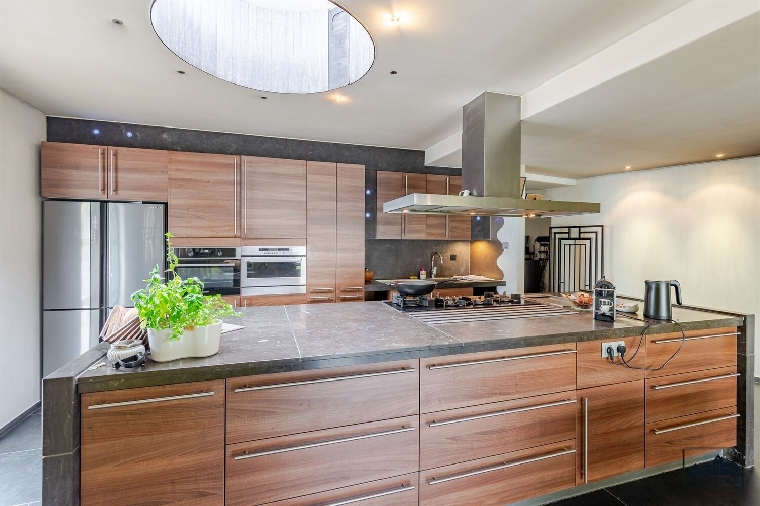 Lichtrijke woonkamer en volledig ingerichte keuken met kookeiland