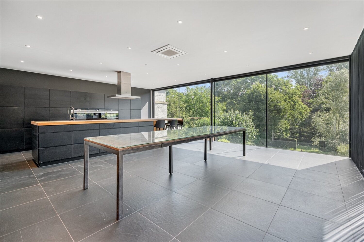 Een open haard vormt het hart van de leefruimte en markeert op elegante wijze de overgang naar de moderne keuken met eetplaats. Deze keuken is uitgerust met alle nodige toestellen en biedt een adembenemend zicht op de grote, groene tuin een oase van rust, perfect om in te ontspannen of te genieten met familie en vrienden.