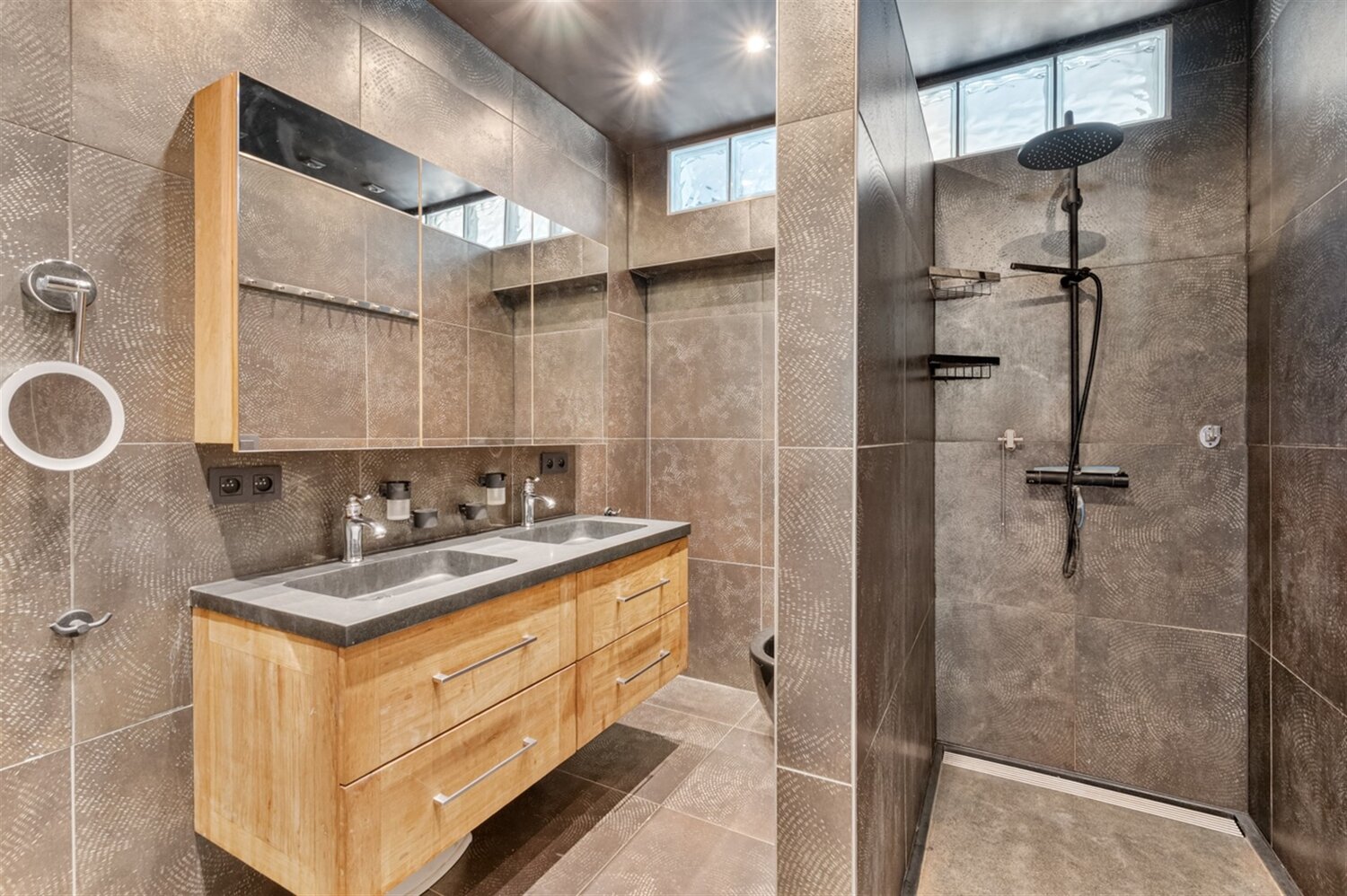 Bij het binnenkomen verwelkomt een ruime en verzorgde inkomhal met gastentoilet. De stijlvolle badkamer is voorzien van een inloopdouche, dubbele wastafel, toilet en bidet. De gezellige leefruimte baadt in natuurlijk licht en vloeit naadloos over in een ruime bureauhoek, slim afgescheiden met een ingewerkte opbergwand die zowel praktisch als esthetisch is.