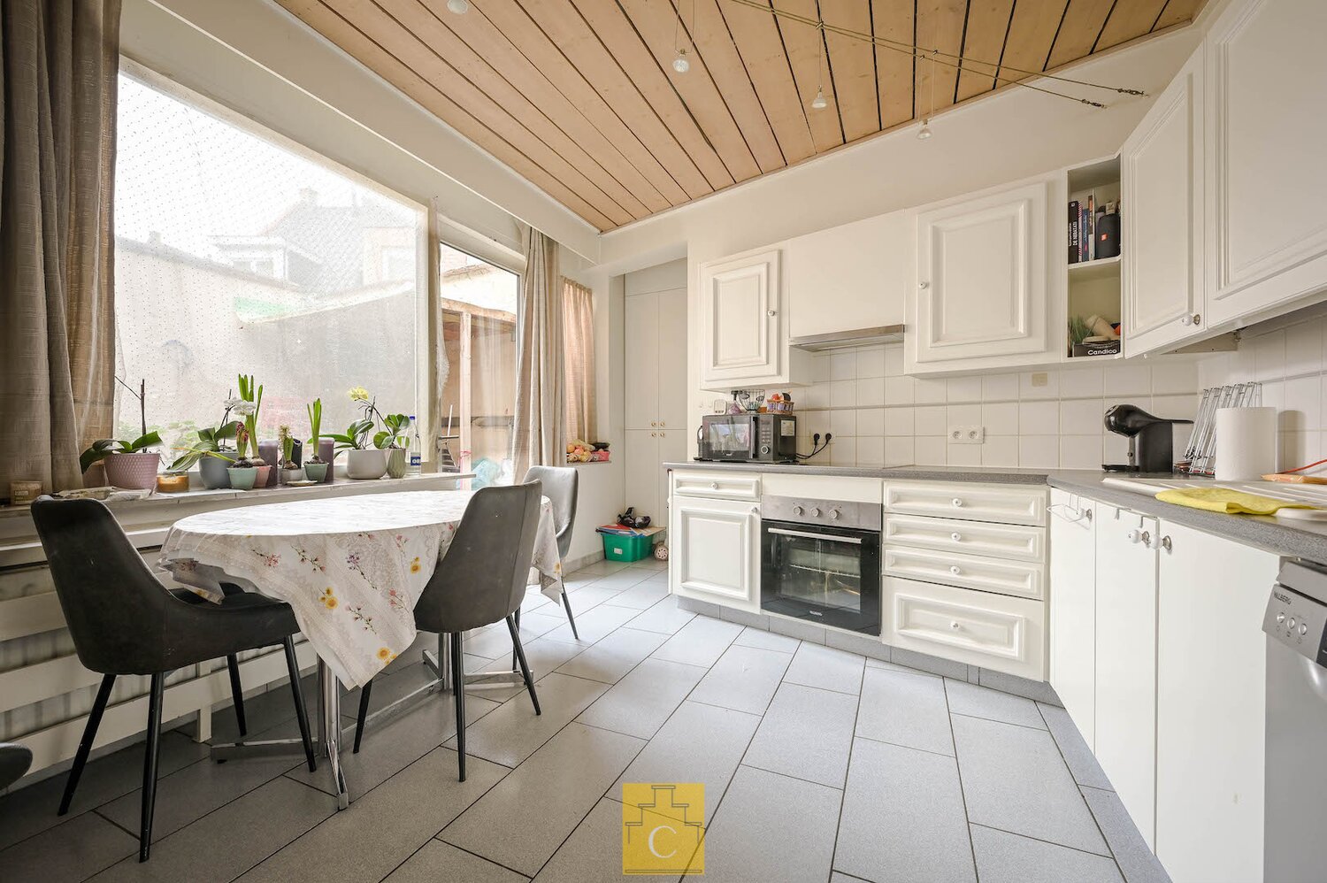 Mits een decoratieve update wordt dit een pareltje. Indeling : op het gelijkvloers is er een inkom, toilet, mooie living over de volledige breedte met zit- en eethoek en open trap naar het verdiep, halfopen keuken met aanrecht, kastjes en toestellen en ontbijthoek. De keuken geeft met een schuifraam uit op het aangenaam terras van circa 15 m2. Aansluitend is er een wasplaats/berging. Op de verdieping is er een overloop, 2 mooie slaapkamers en een ruime badkamer met ligbad, lavabomeubel en toilet. CV gas (condensketel). Niet gelegen in een risicozone voor overstromkngen. P-score : D. G-score : D.
