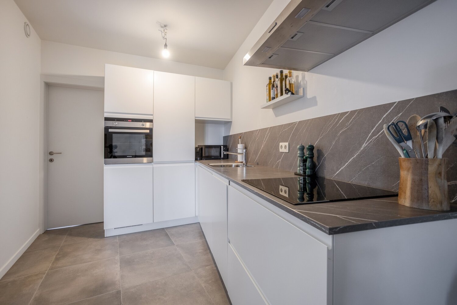 Bij binnenkomst stapt u meteen de lichtrijke woonkamer binnen, van waaruit u rechtstreeks toegang heeft tot het aangename terras. Aansluitend bevindt zich de open, volledig ingerichte keuken en een praktische berging met aansluiting voor wasmachine.