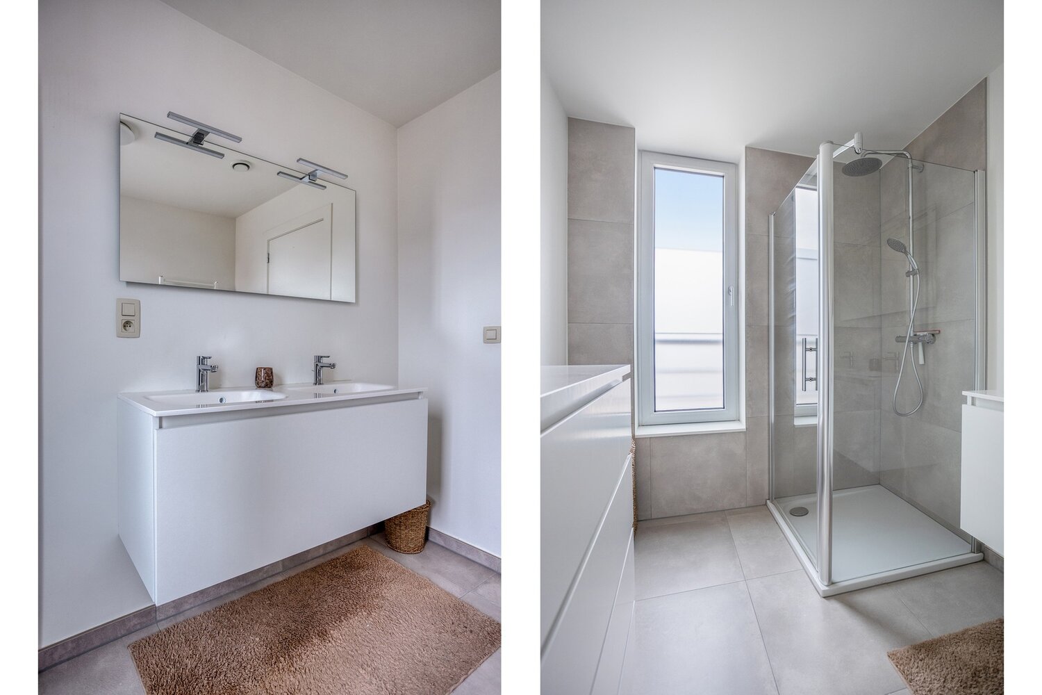 Via de keuken bereikt u de nachthal, die toegang geeft tot het gastentoilet, twee volwaardige slaapkamers en een moderne badkamer, uitgerust met een inloopdouche en een wastafel met dubbele lavabo.