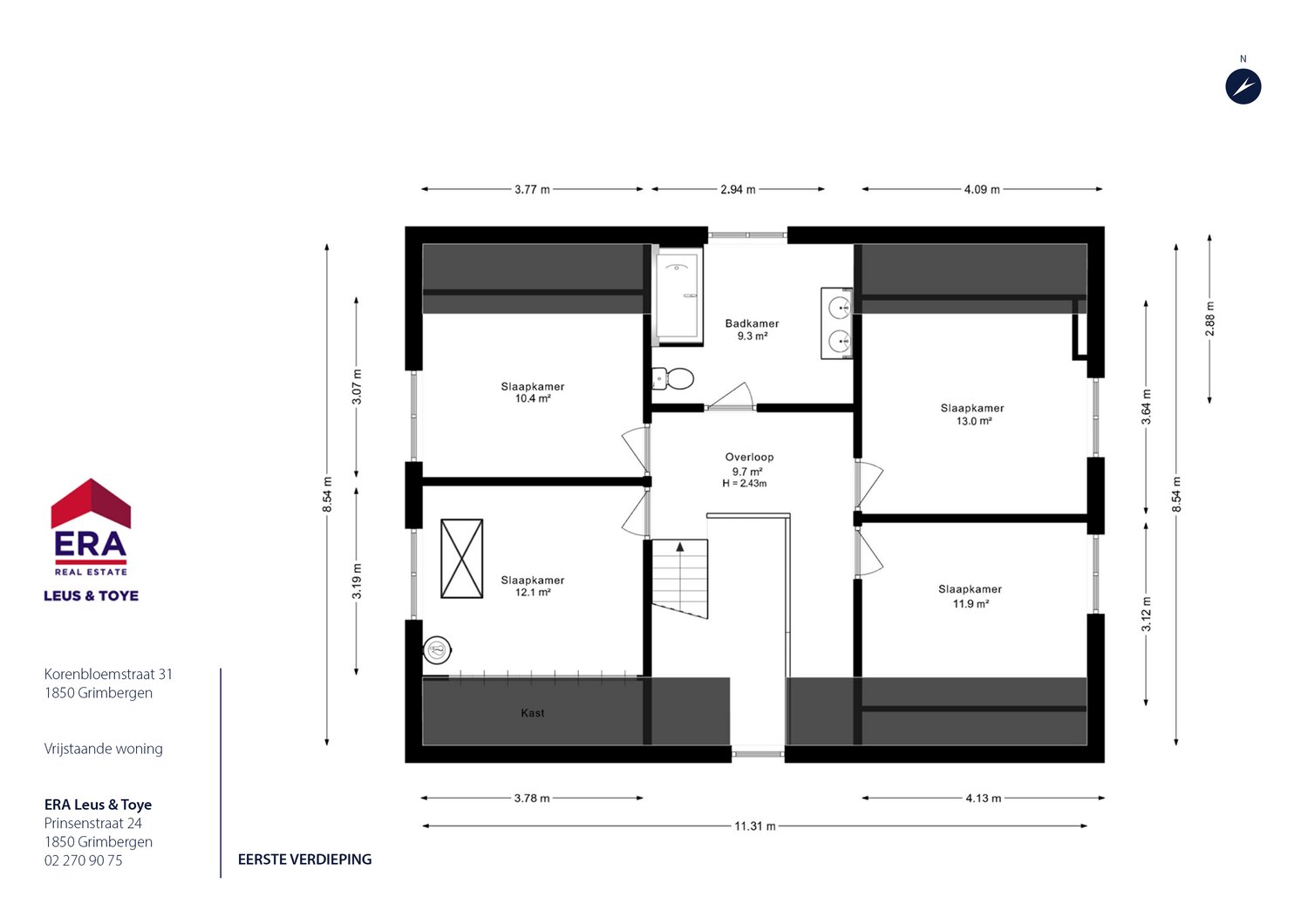 • Vier slaapkamers (10,4 m² – 13,0 m² – 12,1 m² – 11,9 m²), elk geschikt voor slaap-, werk- of hobbyruimte.