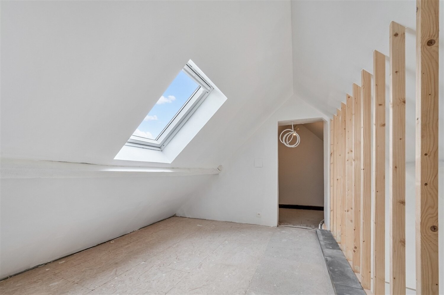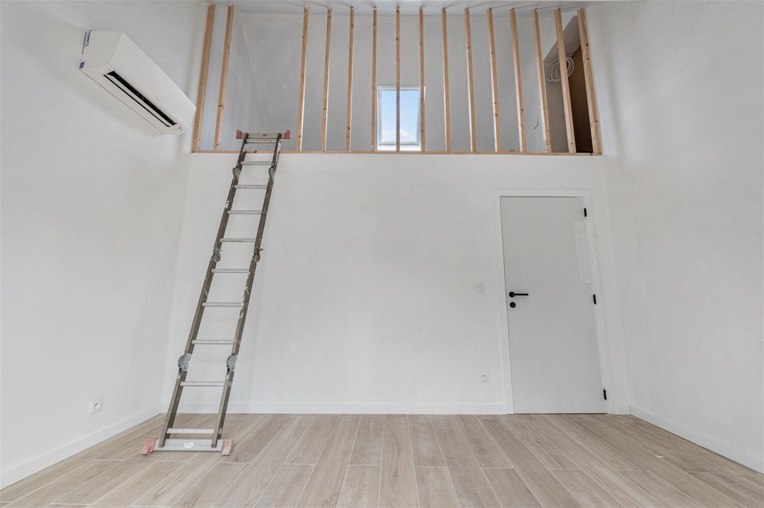 De indeling omvat verder een inkomhal, een apart gastentoilet en twee slaapkamers, waarvan één voorzien is van een charmante mezzanine, ideaal als extra slaaphoek, bureau of hobbyruimte. De moderne badkamer is afgewerkt met een ruime inloopdouche en dubbele lavabo.