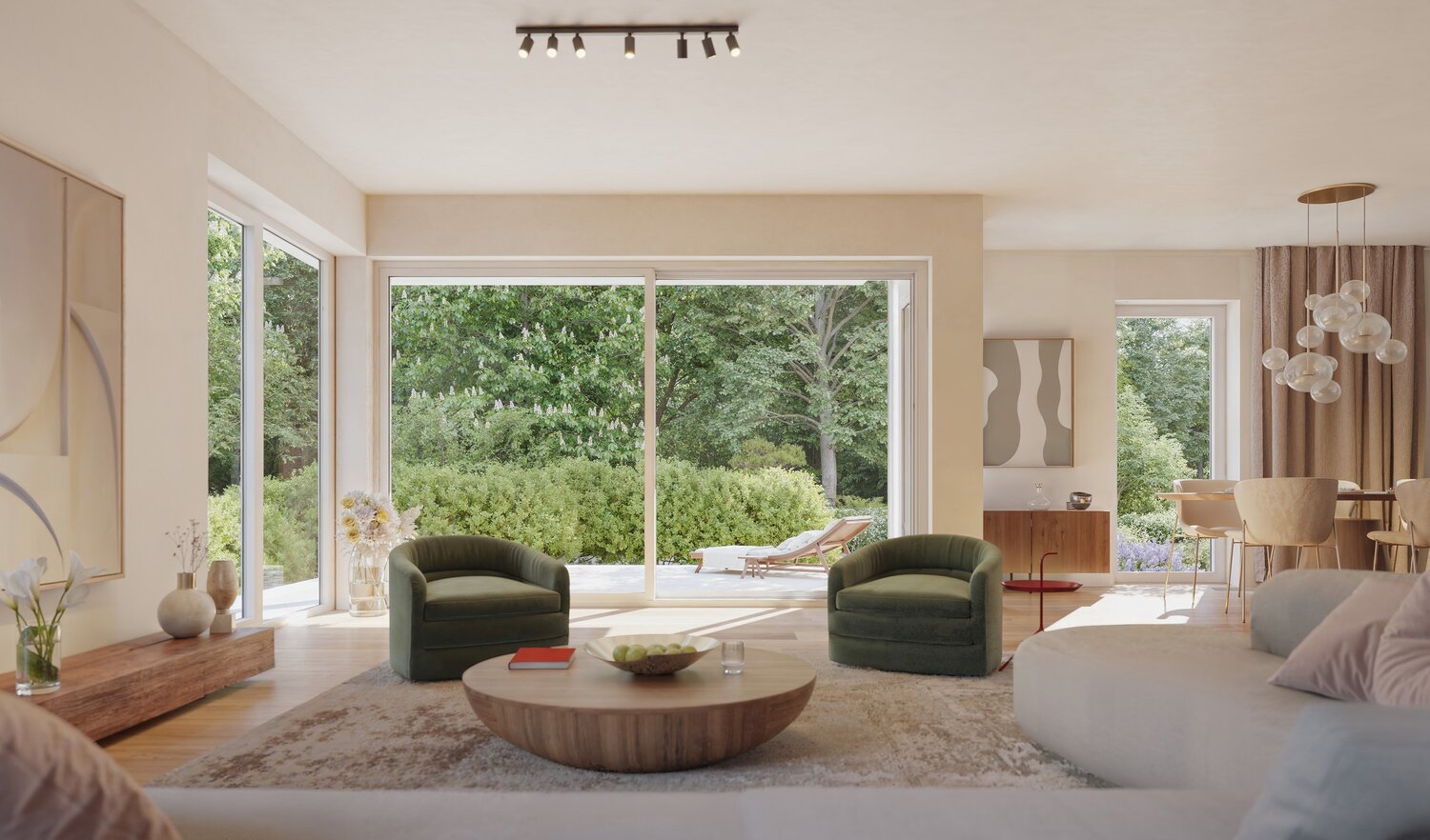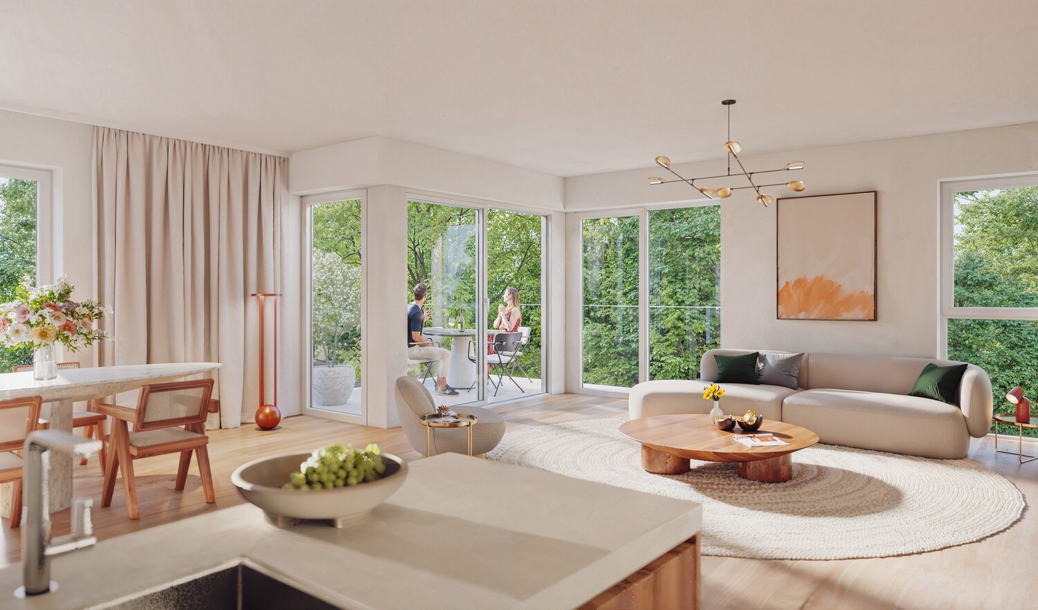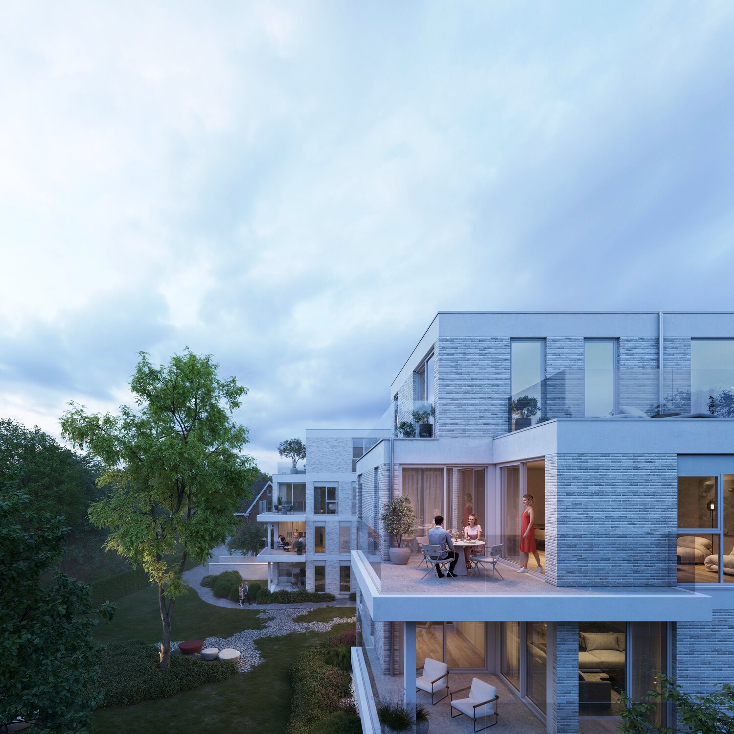 Via de inkomhal met vestiaire betreedt u dit prachtig gelijkvloers appartement. De inkomhal geeft u toegang tot de ruime woonkamer met open keuken. Via een groot schuifraam bereikt u het zonnige terras van 24 m² met uitzicht over de groene omgeving.