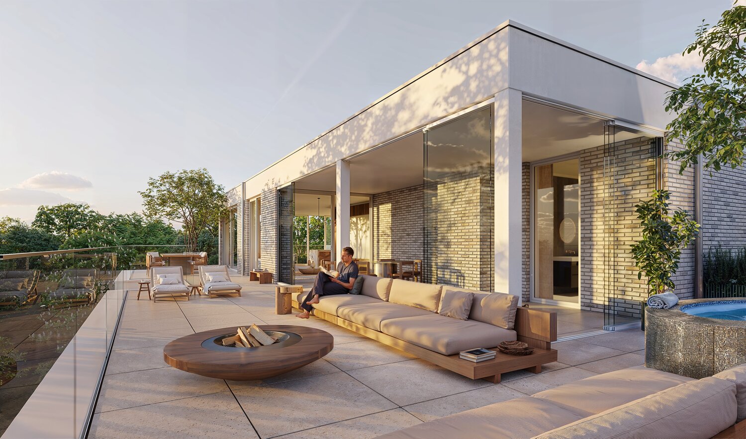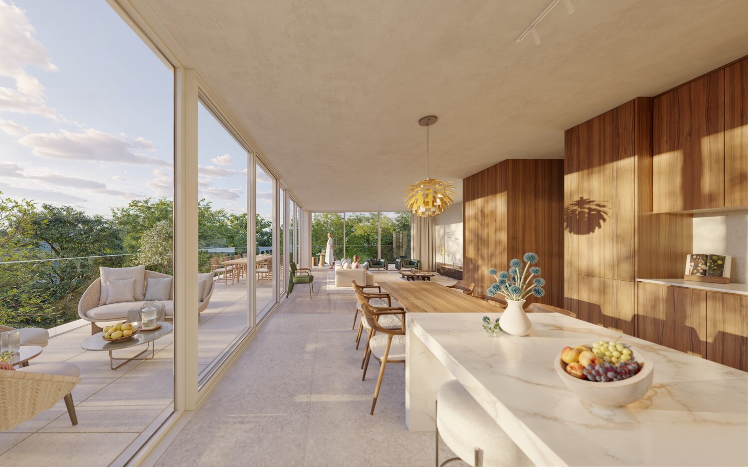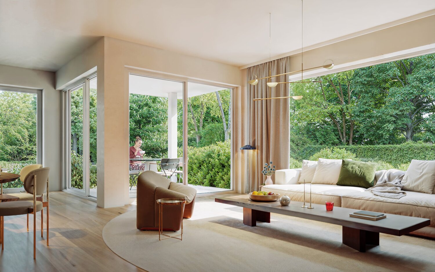 Via de inkomhal met vestiaire betreedt u dit prachtig gelijkvloers appartement. De inkomhal geeft u toegang tot de ruime woonkamer met open keuken. Via een groot schuifraam bereikt u het zonnige terras van 24 m² met uitzicht over de groene omgeving.
