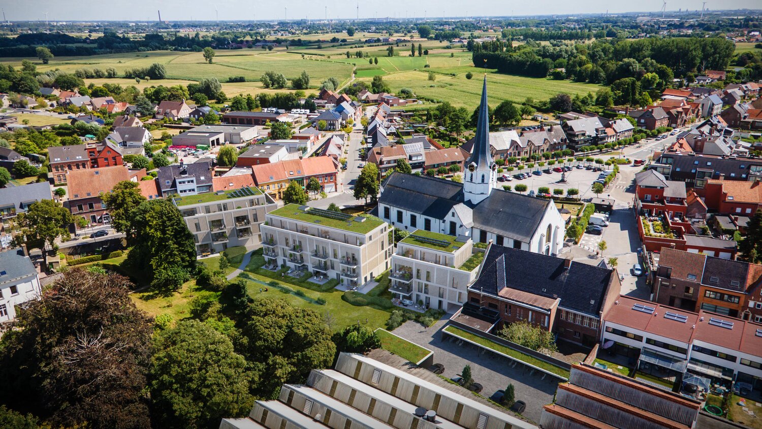 Nieuwbouwproject in het centrum van Sleidinge, effectief naast de kerktoren van Sleidinge, deelgemeente van Evergem.