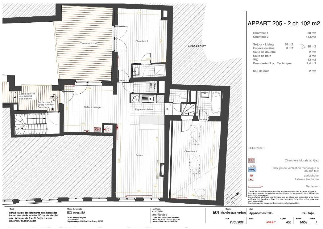 In het hart van Brussel, binnen de perimeter van het Unesco Werelderfgoed, en met een aangename toeristische vibe, ligt het kleinschalige renovatieproject “Ilot 1696”, op de Grasmarkt 46. Het bestaat uit 12 appartementen die de Brusselse sfeer van weleer, oude balkenstructuren en modern comfort combineren, waaronder een prachtig verhuurd appartement te koop van ± 102 m² en ± 21 m² terras, op de 2de verdieping, met ruime woonkamer en open volledig ingerichte keuken, ruim zonneterras, 2 slaapkamers, badkamer, douchekamer, berging en apart toilet. Andere kenmerken: - individuele gasverwarming, - toegang tot gemeenschappelijke wasplaats (met MIELE-apparatuur), - originele plankenvloeren, volgens oude principes gekaleide muren, - gerenoveerd met aandacht voor het authentieke karakter, - stores en verlichting aanwezig, - nabij stadscentrum, winkels, restaurants en openbaar vervoer. Kosten: 140€ gemeenschappelijke ruimten (onderhoud, water, afval, onderhoud van verwarmingssysteem & ventilatie)