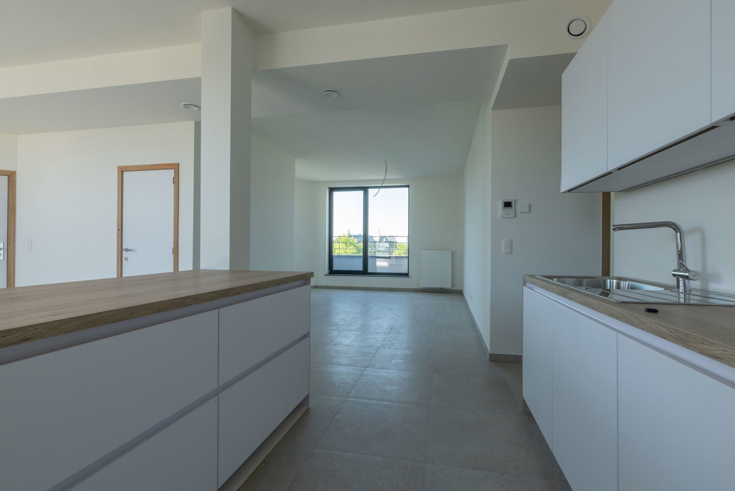 Bij binnenkomst wordt u verwelkomd in een ruime inkomhal met gastentoilet. De lichtrijke leefruimte, met grote raampartijen en hoge plafonds, baadt in het daglicht en biedt rechtstreeks toegang tot het aangename terras. Aansluitend vindt u een aparte, volledig uitgeruste keuken met hoogwaardige toestellen.