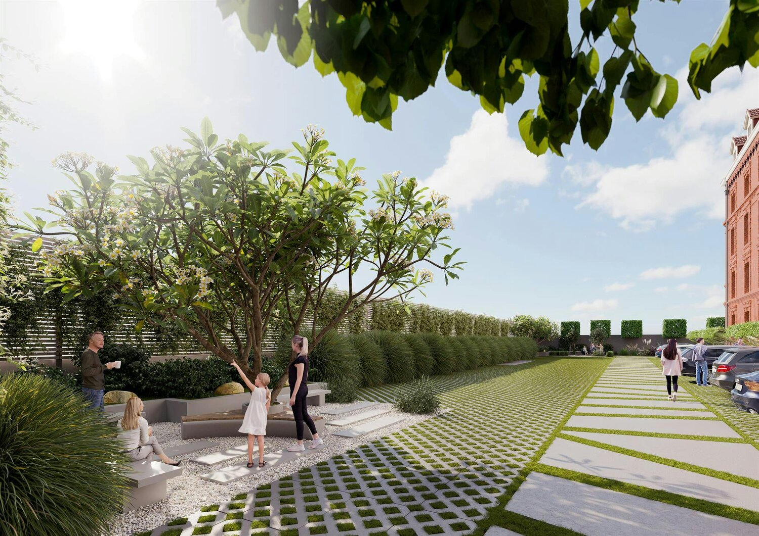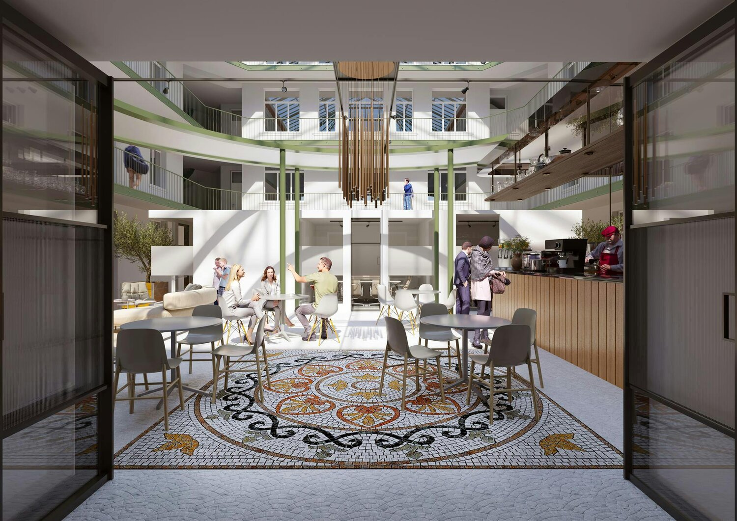 In en rond het centrale zonovergoten Atrium komen een ontmoetings-en-coworkingsplaats voor bewoners, 57 appartementen (van 1 tot 6 slaapkamers), met kelders, parkings en een gemeenschappelijke (moes)tuin.