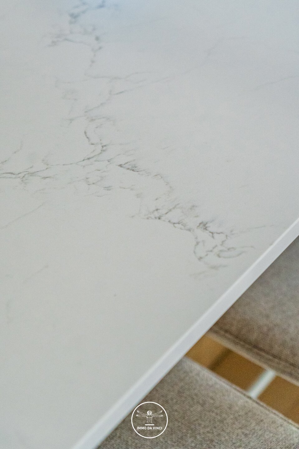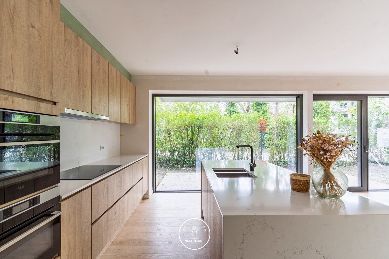 Een elegante glazen deur brengt u naar de leefruimte met open keuken voorzien van kookeiland.