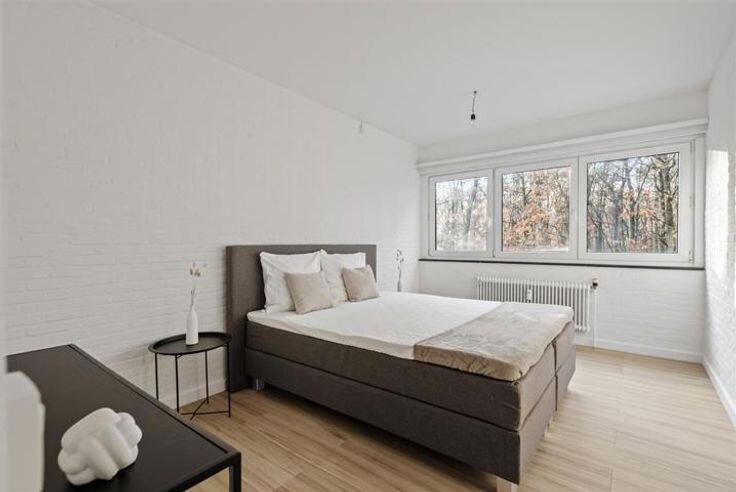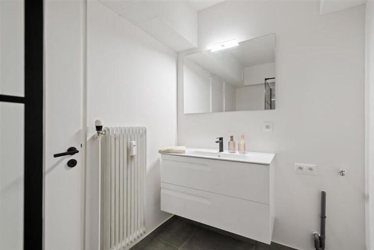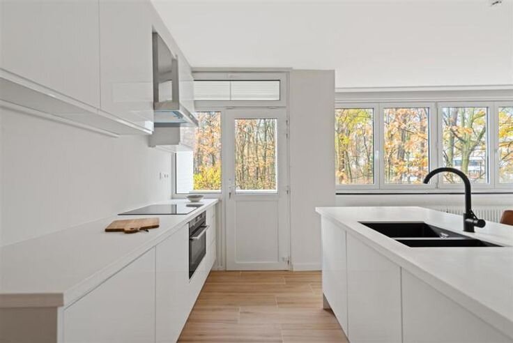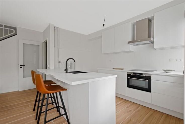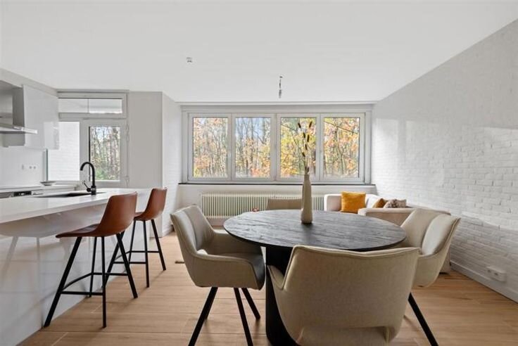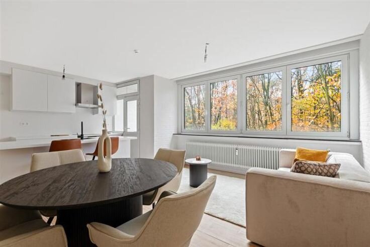 Duplex in een uitzonderlijke groene en rustige omgeving. Dit appartement werd volledig vernieuwd en u kan er genieten van een strakke open keuken afgewerkt met corian werkblad uitgerust met een moderne kookplaat, dampkap vaatwasser en combi oven.