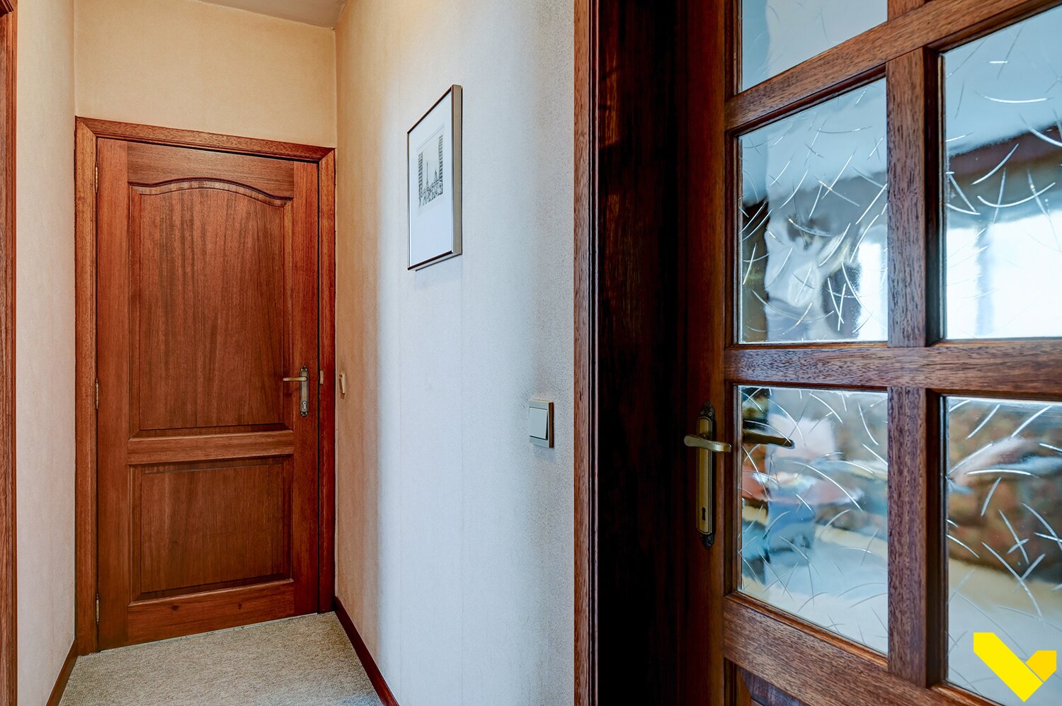 We betreden deze woonst via de inkom aan de voorzijde van het gebouw (kleinschalig project van 3 eenheden).