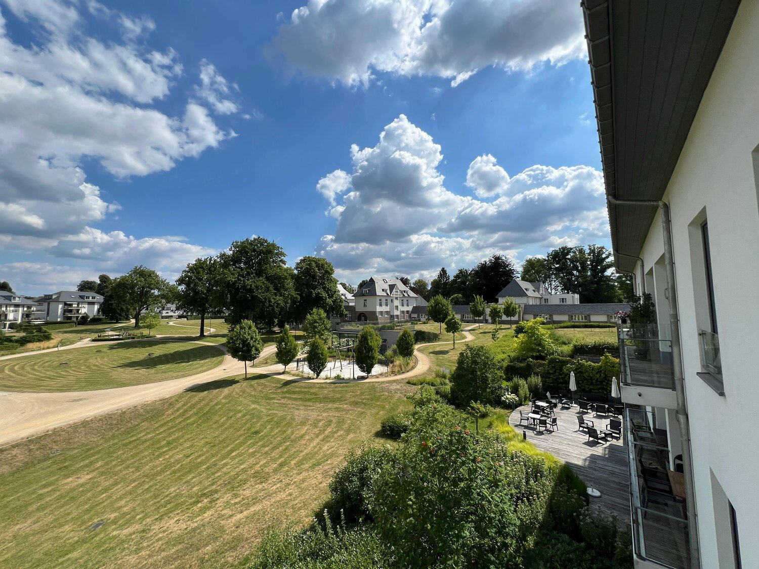 Een ruim park met speeltuinen voor kinderen.