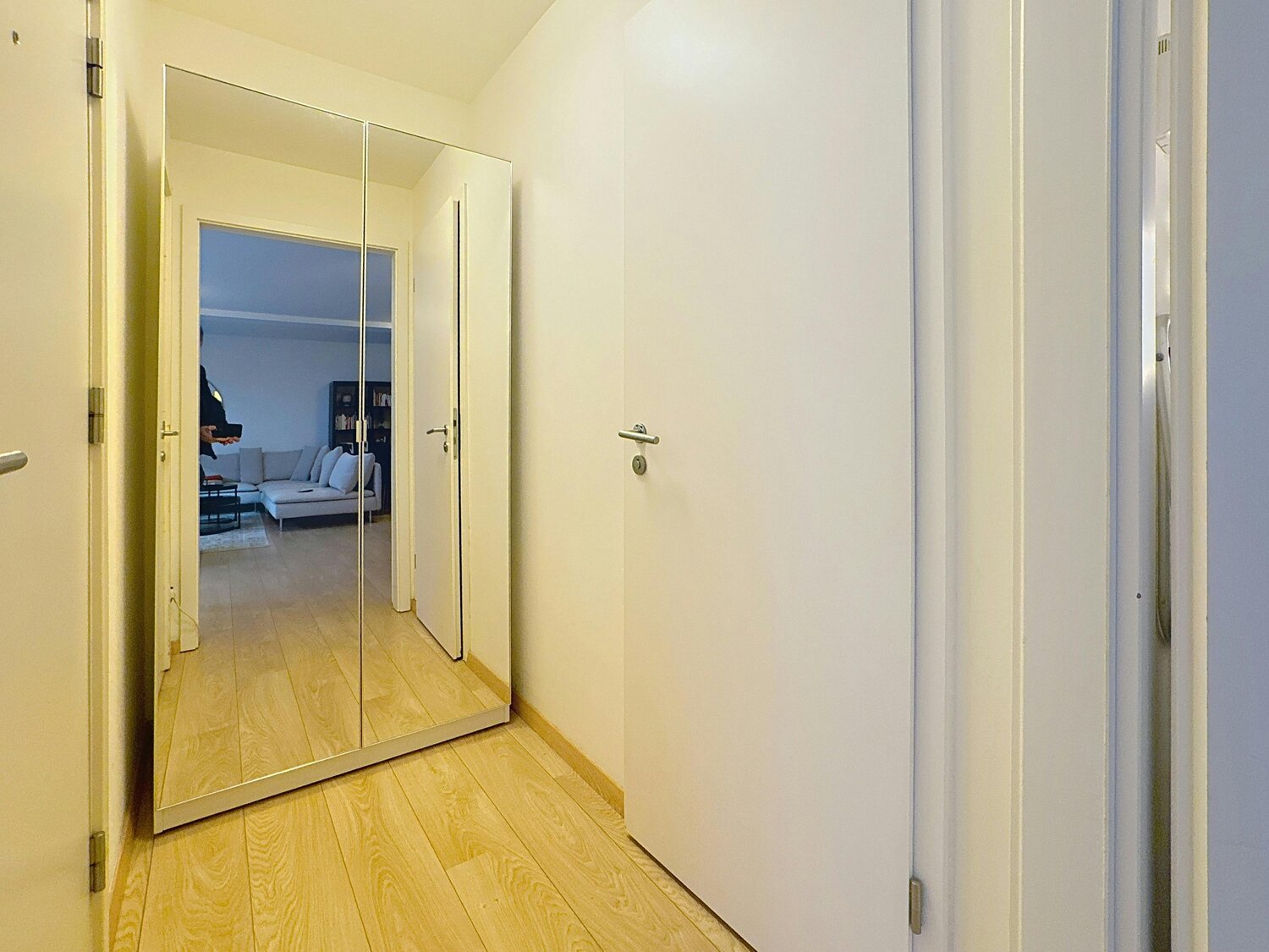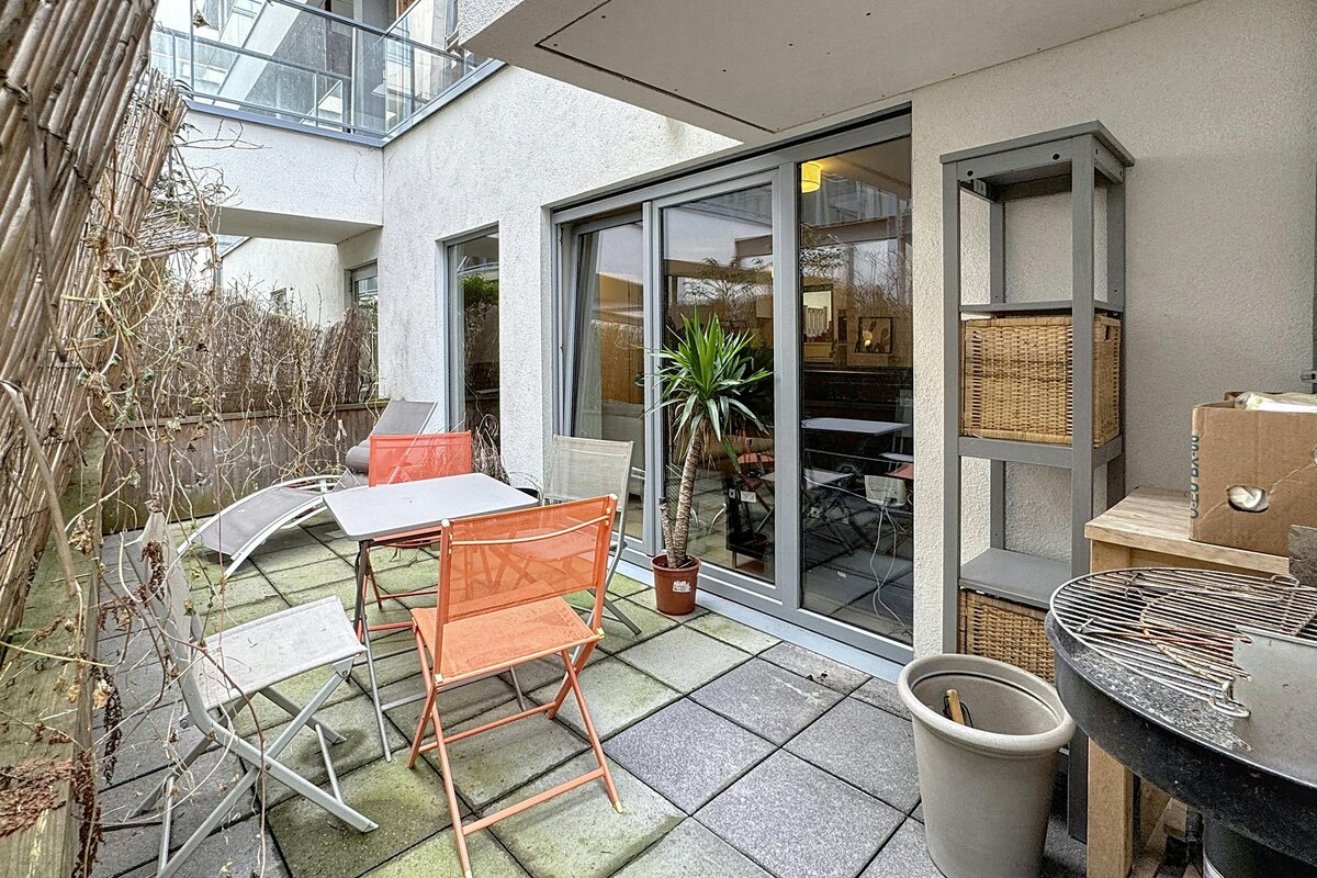 - ruime woonkamer met parket en open ingerichte keuken (Bulthaup B1) en toegang tot het terras van ± 14 m²,