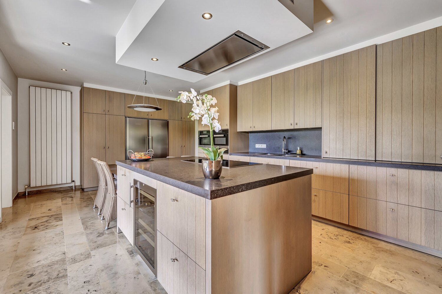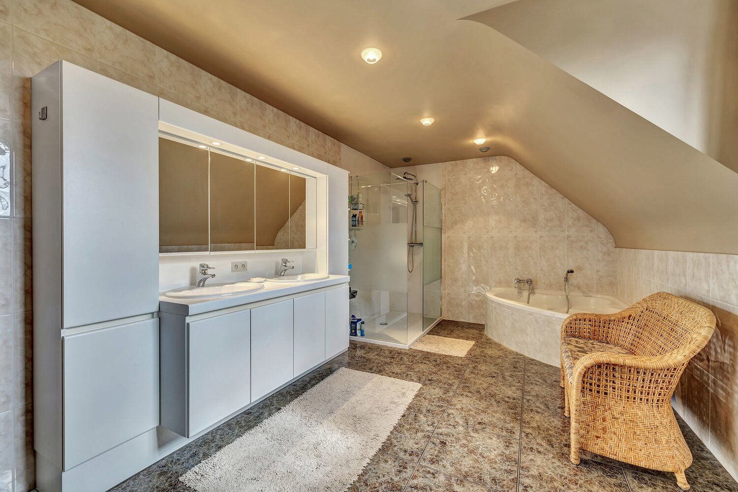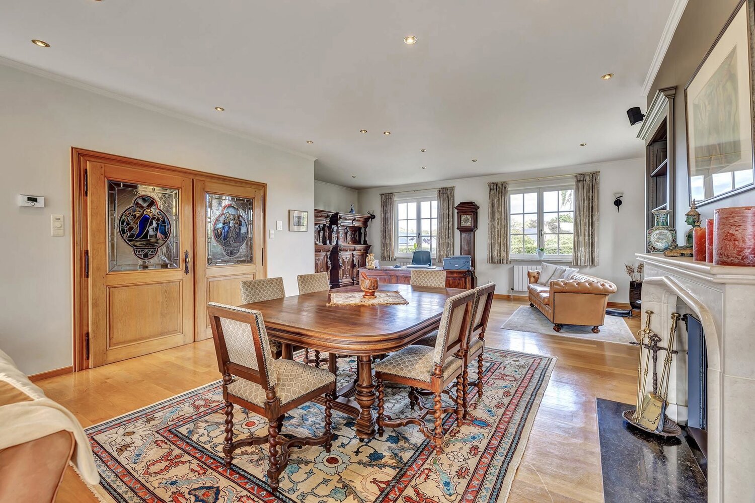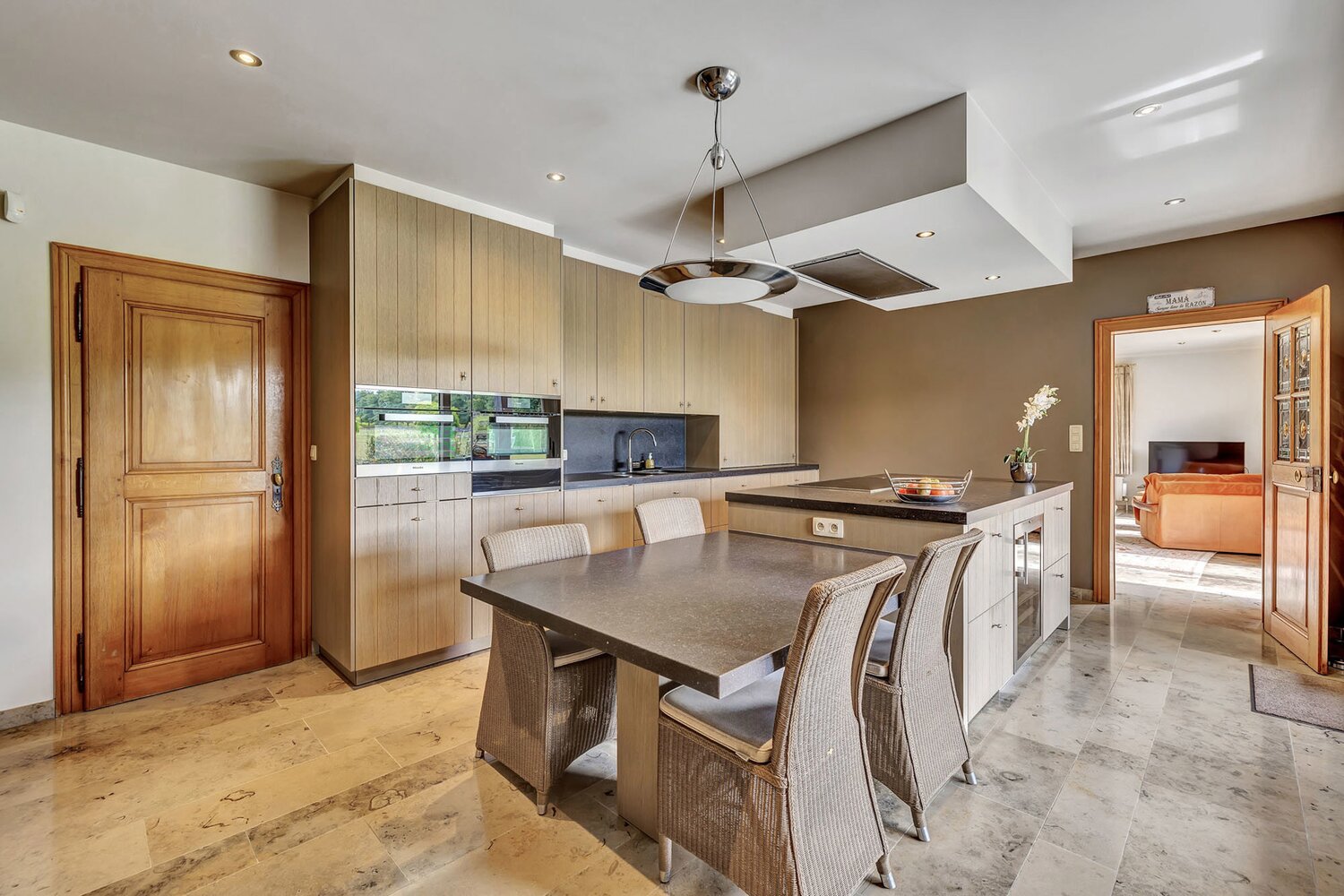 Voor meer info of een bezoek, bel 053 59 49 34 - Voor meer foto's, check www.topo-immo.be - Op een prachtige, groene ligging in Lennik bevindt zich deze hoogwaardig afgewerkte villa. De locatie vormt meteen de eerste troef: midden in het groen, in een rustige straat en toch op slechts enkele minuten van het centrum van Lennik, waar u alle nodige faciliteiten (winkels, openbaar vervoer, scholen, …) terugvindt. De woning werd gebouwd in 1993 en doorheen de jaren perfect onderhouden. Ze is volledig opgetrokken in beton en beschikt over een onderkeldering van ca. 60 m², twee inpandige garages en drie buitenstaanplaatsen. De totale bewoonbare oppervlakte bedraagt maar liefst ca. 550 m². We betreden de woning via de stijlvolle inkomhal die toegang biedt tot de verschillende ruimtes. Het gelijkvloers omvat een ruime, lichtrijke woonkamer met aansluitend de vernieuwde, hyper uitgeruste keuken met praktische berging. Daarnaast zijn er de garages en een bureauruimte van 30 m², die tevens kan ingericht worden als vijfde slaapkamer. Op de eerste verdieping bevinden zich vier royale slaapkamers. De masterbedroom (ca. 45 m²) beschikt over een dressing en een eigen badkamer. Een tweede slaapkamer werd voorzien van aansluitingen voor een douchekamer (nog te installeren). De derde en vierde slaapkamer delen een gemeenschappelijke badkamer. De zolder, bereikbaar via een vaste trap, biedt extra opbergruimte. Buiten geniet u van een volledig aangelegde, zuidgerichte tuin met terras, waar rust en privacy centraal staan en u een prachtig uitzicht heeft op de omliggende natuur. Bovendien werd recent een kwalitatief tuinhuis in hoogwaardig materiaal geplaatst. Kortom: deze villa combineert ruimte, comfort en een uitstekende ligging midden in het groen, vlak bij het centrum van Lennik. Gunstig EPC (B) - Prachtige ligging - Rustige straat - Betonnen constructie - Instapklaar - Goed onderhouden - CV op gas - Dubbele beglazing - Hoogwaardige materialen